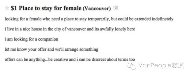 温哥华房价、房租虽然已经下降了,但显然还是不够,天车站附近一个一居室的公寓单位每月租金还得至少$2000。一些钱包吃紧的人开始选择“出卖”身体,来给自己寻求栖身之地。 ![]() 房东有房在手,任性点可以理解,但是借此兽性大发,是不是有点。。。最近在Craigslist等分类信息网站上,有人公开打出不要房租要Sex(rooms-for-sex)的广告:其中有些广告很露骨,有一则广告称靓房一套虚位以待,寻“荡妇”(sex slut);有的也一点不避讳,说什么先交朋友后上床,房租之事好商量;稍微婉转的一点说,家里只有一张床。。。 ![]() ![]() CTV称,有的广告看起来颇为规范全面,条款清晰:“如果你干干净净会煮饭,不介意偶尔FWB [friends with benefits] sex,象征性地收少量租金”;另一则广告干脆标有警告的字样,称“我有时需要午夜特别服务,不要胖子。” 还有一则广告直接写道:“房间免费,每周1-2次”。 总之,温哥华图谋不轨的房东很多,各有各的口味,各有各的要求。。。 CTV的一位化名April Lim的女记者对广告上的房东进行调查。她按广告中的电话打给其中一名信息发布者,这名房东约Lim在温哥华一商场附近碰面。 当Lim带着暗藏的录像机与他见面时,这位房东先介绍说他的房子在本拿比(Burnaby),半地下室出租,然后他直截了当地告诉Lim,他每晚工作回来之后要sex,然后要spend night together。 “你喜欢女上男下吗?”“你喜欢主动吗?”房东还当面问了Lim这些问题。一点都不避讳自己的重口味。 ![]() 后来,这位房东还追打电话来,更加露骨地说,要不咱们就玩得野一点,比如说我们可以选在客厅的沙发上。。。 ![]() Lim 找到另外一则广告,该广告称“与干净优雅之人共享免费房间”。女记者带着暗藏的录像机在温哥华市中心见到广告发布者之后,后者坦言,所谓“共享房间”其实是同睡一张床,但他强调,Lim不愿意也无所谓,想租他房子的人非常非常多,他收到至少1,000个电邮。 从CTV暗藏的录像可见,他们见面时房东亮出了他的手机,手机屏幕上确实有收到电邮的提示。房东说,“同睡一张床”的床是在位于Burrard Street的一居室公寓内,租期可以无限长,只要Lim愿意和他sex;一旦不愿意sex,那么租期立马结束。他还一本正经地强调,租房期间Lim必须很nice,如果她和之前的那些人一样不乖,那么他会请她走人。 ![]() 其他的一些广告较为隐晦,对英语不太熟练的人来说更加危险。可能在没完全听懂的情况下,稀里糊涂地就答应了房东的条件。 按照加拿大现行法律,卖淫不犯法,但嫖娼就属违法。以性换取住处可以视作卖淫,但这个现象其实并不新鲜。归根到底要看提供性服务的人是否认为自己进行的是商业性的性活动。“以性换租”是灰色地带,随着同居时间延长,卖淫和常规性生活的界限会模糊。一旦两人同居一段时间,就可以视作“事实上的情侣关系”而非商业关系。 这些房东都拒绝接受媒体的正式采访,但其中一人透露,他已经找到了愿意“献身”的租客,房子租出去了。 各取所需的人会走到一起,自古如此。 温哥华警方表示,曾经收到过房客关于房东非礼的投诉,他们也了解以性换房的事实,但在多数情况下,女性房客基本都是成年人,她们与房东有约,而且是两厢情愿,因此警方一般情况下是不予干涉的,除非出现了非法禁锢以及强迫的性行为等案件。 |