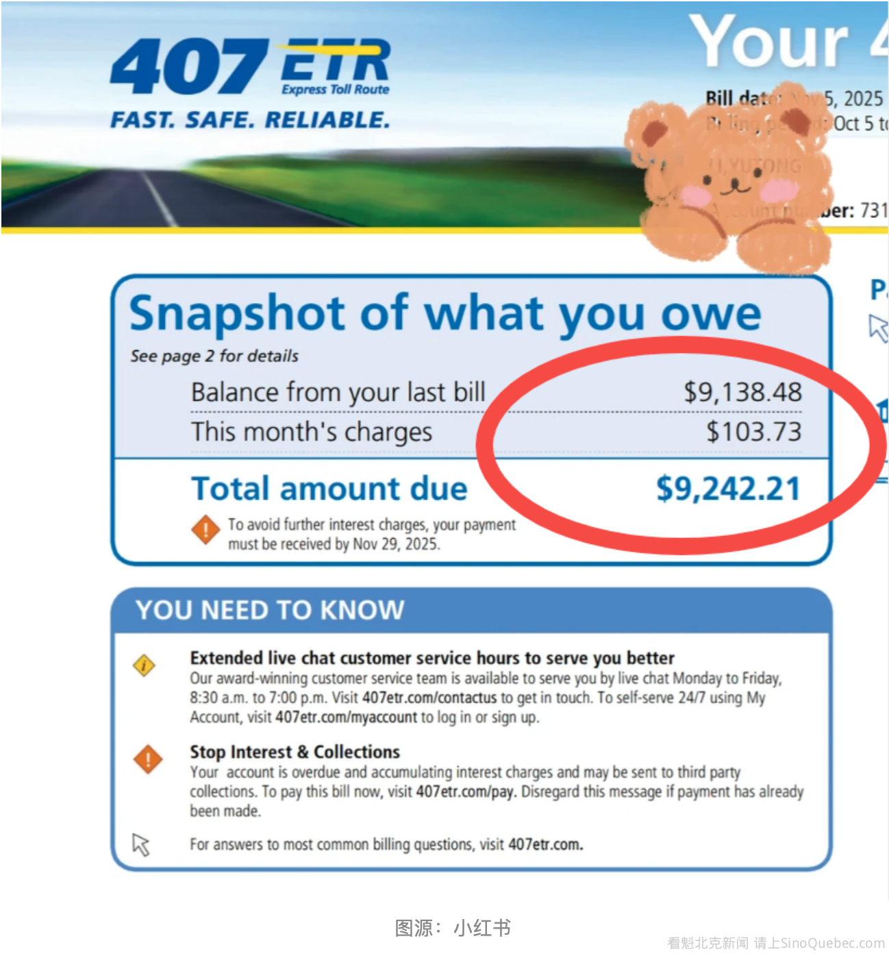 多伦多一位华人回国几年,返加后忽然接407欠费账单9242加元,哭笑不得,只能先忍痛付了账单,留待以后慢慢与407交涉。 小红书网友@ko怪发帖说:加麻大,今天交清了。这欠费不秀一下都TMD可惜了。 一位网友评论说:弱弱想问事情的经过? 作者回复说:transponder 丢了,然后我人在国内不知道。扣费了两三年,加上后面两三年利息。 一位网友评论说:真心为你口袋疼。 一位网友评论说: 意思别人用了你的 transponder,然后你付钱? 作者回复说:嗯呐, 我也不知道谁用的… 一位网友评论说:可以打电话跟407谈的。 一位网友评论说:transponder不是跟着车牌走的吗? 一位网友评论说:提供你人在国内的证明可以 dispute 吗? 一位网友评论说:即使是你的transponder,也能拍到使用车辆的车牌,我的一个就会放不同车上用,账单会显示哪辆车跑了哪里。 一位网友评论说:富豪,钱都交了?也没申诉? 作者回复说:申诉了,也交了… 一位网友评论说:transponder不跟车牌,别人拿了你的transponder 也只是省个拍照费,账单还是记到他车牌下的 你这个大概率是被套牌。 作者回复说:是,我这就是transponder丢了。 别人直接拿去用了好几年… 麻了 这东西完全不需要车牌背书的,车牌只是用来申请transponder… 一位网友评论说:我用过我的transponder在其他车上,账单确实是寄到车牌下的帐户的 我的帐户里没有任何charge,他的情况我感觉大概率还是有人用了他的牌照 直接走的407,和transponder没关系 最简单的办法就是点进去账单看一下明细就好了,如果你想深入研究一下的话 我可以把我的transponder给你试试。 作者回复说: 嗯, 是的。所以我用的话费用也是在你账户里。 那你就成我了。 一位网友评论说:我就走了一次407,要我交300多,至今没交不知道会怎样? 作者回复说:你可以查查账单, 可能你才是主宰407大佬… |
