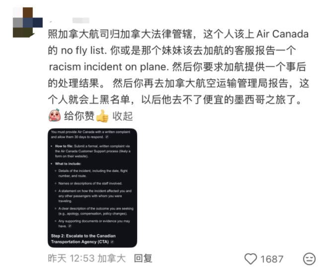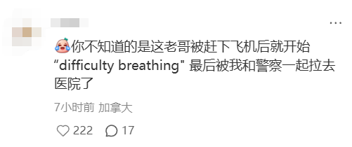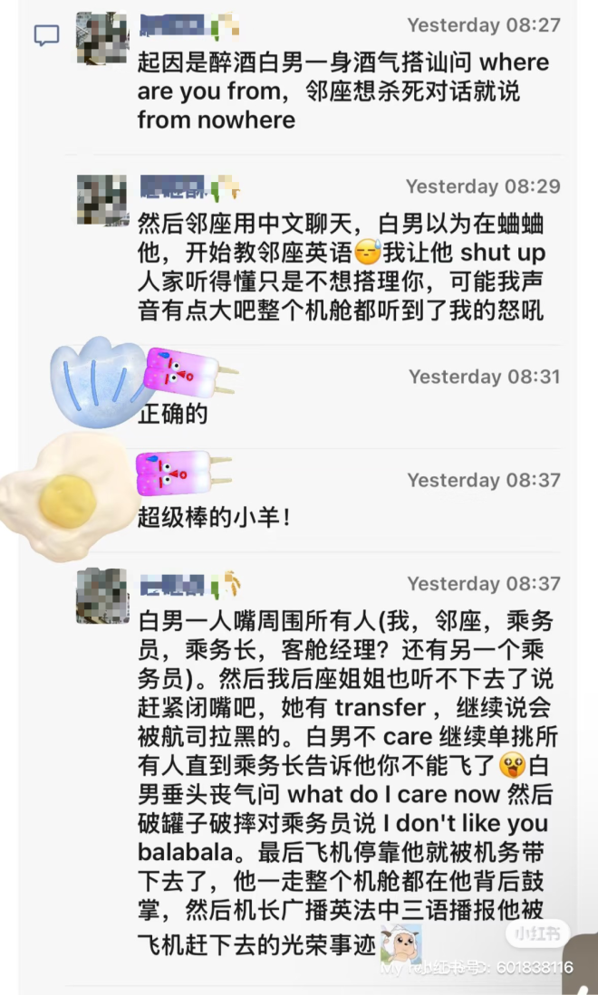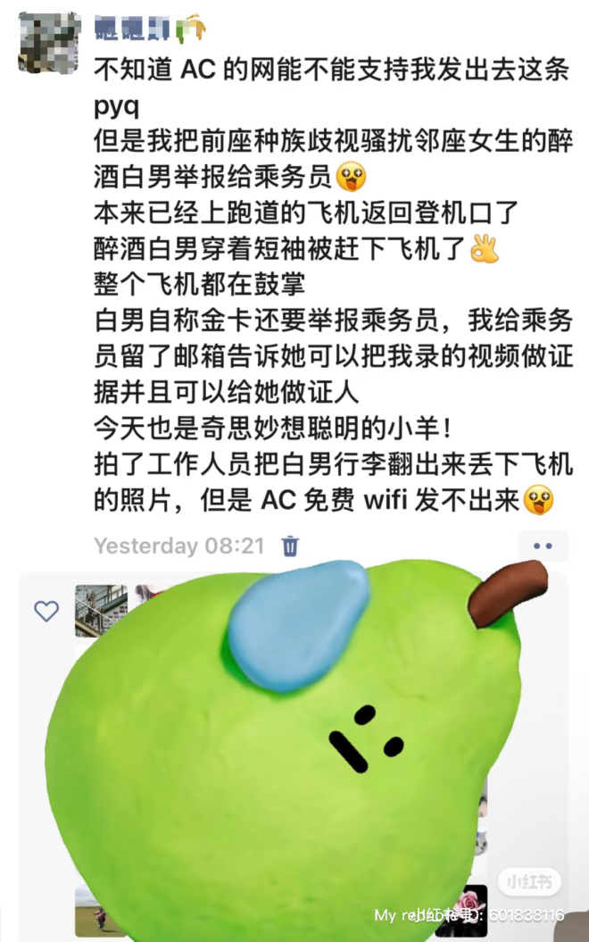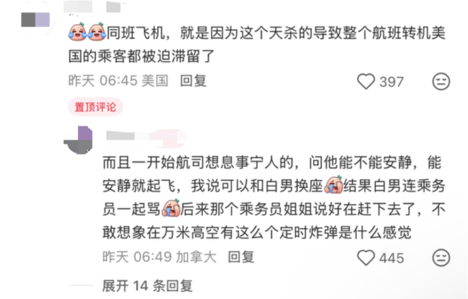近日,在一架前往多伦多航空航班上,一名醉酒白人男子因骚扰邻座中国乘客并多次使用侮辱性、歧视性言论,最终被机组人员勒令下机,全机乘客鼓掌欢走。 醉酒男子辱骂邻座中国女生 12月15日,加拿大航空AC62航班在首尔仁川机场滑行准备起飞时,机舱内发生一起争执。据当事人之一的孙女士(哈尔滨人,现于多伦多附近读博)介绍,她当时坐在机舱右侧靠窗位置,注意到前排一名满身酒气的白人男子主动搭讪右侧两名中国女生,开口便问:“你从哪来的?” 孙女士描述,前排中间的中国女孩年仅19岁,正在读大二。 面对男子带有审视意味的提问,被骚扰的女生冷淡回应“From nowhere”,试图终结对话,随后与同伴改用中文交谈。 没想到,这个举动反倒激怒了该男子。 他认定对方是在背后议论自己,突然开始“教”起对方英语:“你坐在32排,three、two,懂吗?这是不同的语言,明白不,蠢货?” “我之前从没被你们这样的人这么对待过......” 话语中不断夹杂脏字,态度极其嚣张。 ![]() (图片来源:小红书) 被骚扰的女生无助地询问同伴:“哪个呼唤铃可以叫乘务员?我不能让他在这骂人啊,我什么都没干。” 此时,坐在后一排的孙女士早已用手机记录下整个过程。 眼见冲突升级,孙女士无法坐视不理,果断替前排女生按下呼唤铃,随即起身向该男子大声说道:“请对这些女孩保持尊重!” 对方试图反驳,却被孙女士一句“闭嘴!她们完全听得懂你的话,只是不想被你骚扰,明白吗?”直接打断。 男子仍不依不饶,孙女士则更加严厉地回击道:“不,该闭嘴的是你。” 男子反骂机组人员 乘务员闻讯赶来后,孙女士清晰说明了情况:“他一直在骚扰这些女孩,骂她们蠢货,反复说脏话。” 当男子挑衅地质问“你不是录视频了吗?给乘务员看啊”时,孙女士冷静回应已全程录像,表示:“她们讲中文不等于你可以指手画脚,你这是种族歧视行为。” 随后场面进一步升级。 该醉酒男子非但没有收敛,反而继续与前来处理的乘务员、乘务长争执不休。 即便有其他乘客提醒“再闹下去可能会被航空公司列入黑名单”,他也毫不在意。 机组最终做出决定:请他下飞机,刚才还气焰嚣张的男子顿时泄了气, 被带离时垂头嘟囔:“我现在还怕什么?” 接着又冲着乘务员自暴自弃地喊了一句:“我不喜欢你!” 飞机为此退出跑道,返回登机口。 当地勤人员将只穿短袖的他带离机舱,并将他的行李从货舱翻出、丢在停机坪上时,整个客舱爆发出一阵热烈而持久的掌声,许多乘客如释重负。 ![]() (图片来源:小红书) 不久,机长用中、英、法三语广播向全体乘客说明:“现在我们已经让这位乘客下飞机了,我们正在寻找他的行李,当行李找到之后,我们即将出发,感谢您在此时间的耐心等候。” 据悉,该男子在被带离机舱前,还自称是金卡会员,试图对空乘人员提出投诉。 ![]() (图片来源:小红书) 对此,孙女士主动将自己的联系方式留给机组,表示愿意提供完整视频作为证据,并配合后续调查。 孙女士事后表示:“这种事见过很多,这类人往往就是欺软怕硬。看到同胞被欺负,我没多想,就站出来了。” 航旅纵横信息显示,AC62航班原定12月15日20:10起飞,最终延误近一小时,于22时左右起飞,航程约10624公里,飞行时长12小时14分钟。 ![]() 各大网友现身说法 事件在社交平台发酵后,评论区俨然成了另一个“现场”。不少自称同机乘客的网友陆续冒泡,把更多细节补了出来。 网友A表示:“我当时就在这趟航班上。因为这个男的,整趟航班上需要转机前往美国的乘客都被迫滞留了。” 作者回复:“事情刚发生时,航空公司一度尝试息事宁人,先询问白男能否安静下来,我说可以和他换座位。但白男不仅拒绝配合,还当场对乘务员破口大骂。后来,那个乘务员说还好赶下去了,不敢相信万米高空下有这么个定时炸弹得多危险。” ![]() 网友B则补充说,白男被赶下飞机后,又开始声称自己“呼吸困难”,最后被她和警方一起送往医院处理。 ![]() 网友C无奈:“我也在这架飞机上,这家伙真的喝多了,他被赶下飞机时,大家都在鼓掌。飞机也因为这个延误了,但是大家都很理解,很冷静。” ![]() 网友D科普:按照加拿大航空和当地规定,这种人很可能会上加航的禁飞名单。她建议那个被骂的女生直接去找加航客服,把机上发生的种族歧视事件正式投诉一遍,让航空公司给个处理结果;要是处理得不满意,还可以再往上报。只要被记录在案,这人以后想坐加航、想买便宜的跨洋机票,基本都没戏了。 ![]() 总的来说,评论区一边倒地支持并夸赞发帖女生的冷静应对和机组的处置。 在飞机这样封闭的空间里,隐患就该被掐灭在地面。正是因为有人敢录像、敢发声,机组也敢在滑行后返航清人,事态才没有被带到空中。 不管在哪个国家的航班上,不守规矩、践踏他人尊严的人,终究要为自己的行为买单。 信息来源:小红书 |