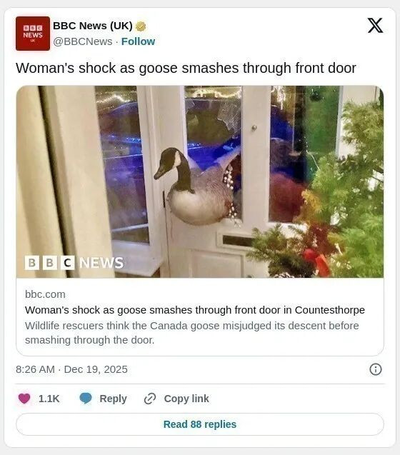 英国莱斯特郡康特索普村近日发生一起离奇事件。一名女子在家中看电视时,突然听到一声巨响,家门竟被一只加拿大鹅撞破,令她惊恐不已。 ![]() 事发于周三晚间,当时林恩·休厄尔(Lynne Sewell)正与朋友伊恩·布洛克在家观看曼城对阵布伦特福德的足球比赛。她起初以为有人试图踹门闯入,因巨响而感到害怕。随后,布洛克外出查看,发现一只体型巨大的加拿大鹅头部卡在前门的玻璃窗中。 休厄尔回忆说,她当时无法判断这只鸟是死是活,“一开始就被巨响吓到了,它又那么大,真的很可怕”。 ![]() (Ian Bullock) 这只鹅随后摇摇晃晃地走到门廊上。布洛克一度以为它是遭遇交通事故,随即联系了英国皇家防止虐待动物协会(RSPCA)和警方,但因事发时间较晚,未能立即获得救援。 两人只好让鹅在门廊过夜,并为它准备了清水、小毯子和燕麦粥。 ![]() (Ian Bullock) 第二天早上,布洛克发现鹅仍然存活,便联系了位于基博斯哈考特的莱斯特郡野生动物医院。 ![]() 医院团队负责人艾米·布洛尔赶到现场,将受伤的鹅带走救治。 ![]() (Ian Bullock) 布洛尔表示,这种情况非常罕见,尤其是在夜间飞入住宅区。她推测,这只加拿大鹅可能因飞行疲劳而误判降落位置,才会撞上玻璃门。 检查发现,鹅仅有轻微伤势,包括喙部和身体左侧的小伤口,整体状况良好。经过止痛药和抗生素治疗后,它将被放归自然。 休厄尔表示,她已将前门临时封住,并将通过保险公司进行维修。她感叹道:“真不敢相信它能撞破玻璃还活下来,这种事情谁都想不到会发生”。 |