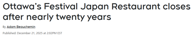 渥太华市中心一家日式餐厅在经营了将近20年后,于本周末永久关门。 ![]() ![]() 图源:CTV 本周早些时候,Festival Japan Restaurant餐厅宣布,其最后一个营业日为12月20日(周六)。 这家位于149 Kent Street的餐厅,近20年来一直在Centretown社区为顾客提供正宗的日本料理。 ![]() 图源:CTV 餐厅老板Samantha Liu在Facebook上写道:“自2006年开业以来,能为大家服务、参与你们的重要时刻,并成为这个社区的一部分,是我们最大的荣幸。你们的支持、忠诚,以及对正宗日本料理的共同热爱,一直是这家餐厅的核心。我们会珍惜在这里留下的每一段回忆。” ![]() 图源:Ottawa Sun 在Festival Japan宣布停业后,餐厅的Facebook页面瞬间被留言淹没: “听到这个消息真的很伤心。你们的餐厅太棒了,我在那里留下了无数与音乐、爵士、美食、生日庆祝有关的美好回忆。祝你和Gordon在新的旅程中一切顺利。很遗憾我没法赶上你们的最后一天营业。” “Samantha,听到你们要关店的消息真的很难过,也很遗憾我没能在停业前回到渥太华。一直都很喜欢你们的料理,以后一定会非常想念。希望你和Gordon接下来的人生规划同样精彩。 “看到这个消息很伤感,但也非常感激这些年来我们在Festival Japan度过的美好夜晚——音乐、好食物,还有彼此的陪伴。谢谢你们这么多年把大家聚在一起!” “我由衷感谢你们带来的快乐、社区感和精致的美食体验。你们对食物品质和贴心服务的坚持,树立了一个会被长久铭记的标准。” “虽然告别这个我们深爱的地方让我感到不舍,但我更希望,这个结束能孕育出一个美好的新开始。愿你们两位我珍视的人,在人生的下一个阶段收获应得的成功与幸福。” “真的很遗憾看到你们离开。你和Gordon打造了一个如此温暖的地方,让人们可以相聚、享受美食和现场音乐。谢谢你们留下的美好回忆!” “听到这个消息很难受,但也衷心祝福你们未来的每一步,并感谢Festival Japan Restaurant带给我们的所有美好时光。” 灯会熄,音乐会停,但记忆会一直在。 |