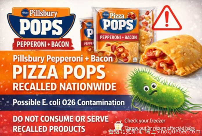 由于可能受到 O26 型大肠杆菌(E. coli O26) 污染,加拿大官方已针对特定的 Pillsbury Pizza Pops Pepperoni + Bacon(培根腊肠口味) 产品发布了全国召回公告。建议消费者切勿食用、使用、销售、供应或分发相关受影响产品。 受影响产品详情 Pillsbury — Pizza Pops Pepperoni + Bacon (30只装 / 2.85 kg) UPC码: 0 69052 12961 9 代码: 09JN2026WN; 10JN2026WN Pillsbury — Pizza Pops Supremo Extreme Pepperoni + Bacon (30只装 / 3 kg) UPC码: 0 69052 46901 2 代码: 10JN2026WN; 11JN2026WN; 12JN2026WN Pillsbury — Pizza Pops Pepperoni + Bacon (8只装 / 760 g) UPC码: 0 69052 12967 1 代码: 09JN2026WN; 10JN2026WN Pillsbury — Pizza Pops FRANK’s RedHot Pepperoni + Bacon (4只装 / 380 g) UPC码: 0 69052 12947 3 代码: 14JN2026WN 如果您持有召回范围内的产品: