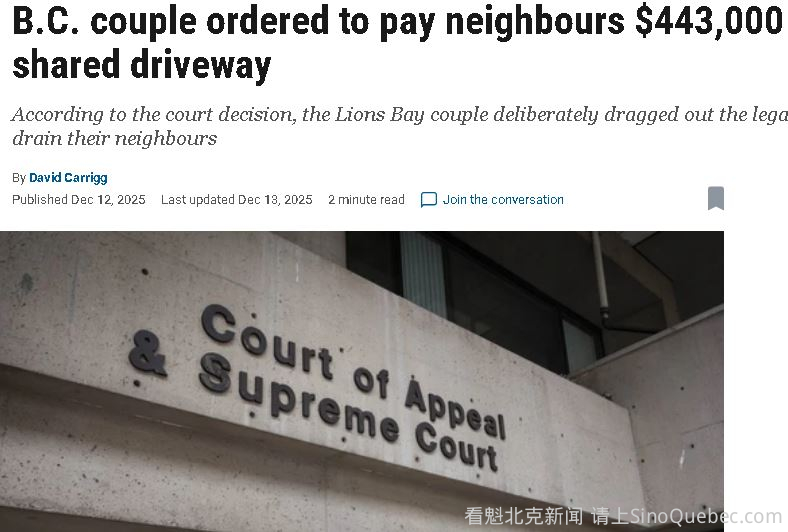 加拿大不列颠哥伦比亚省 Lions Bay 一对华人夫妇在与邻居就共用车道的长期法律纠纷中,被法院裁定需额外支付33.5万元。 根据不列颠哥伦比亚省最高法院助理法官 Amy Peck 的裁决,Tracey Song 和 George Liu 被认定故意拖延诉讼,试图通过高昂诉讼成本“拖垮”邻居 Cindy 和 Richard David。 此前,法院已就该纠纷判给 David 夫妇 10.875万元赔偿,纠纷还升级为“恶劣”的网络诽谤。 此次裁定后,Song 和 Liu 需合计向邻居支付 44.375万元。法官指出,“特别费用”具有惩戒和威慑性质,旨在制止诉讼不当行为。 纠纷起于 2021—2022 年邻居施工引发不满。2022 年 4 月,Liu 在共用车道上挖沟并设置路障,邻居报警并申请禁令后才停止。 同期,Liu 还在社区微信群发布中文帖文,被认定构成诽谤,法院判给加重及惩罚性赔偿。 在是否追加特别费用的评估中,法官认为被告的行为与“耗尽对方财力”的动机一致;同时认可原告律师提交费用主张时克制、谨慎且合理,进一步支持了追加费用的决定。