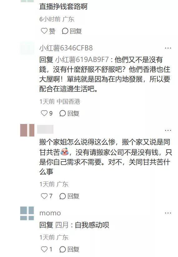 香港明星北上发展已经成为一种趋势,不少港星为了工作方便甚至直接定居内地。除了北京和上海之外,广东省内的城市因为文化接近港澳,也是大家的优选。 最近,洪金宝的儿子洪天明一家从香港搬迁至深圳定居,他的妻子周家蔚在社交平台跟大家分享了这个消息。 ![]() 视频里的周家蔚没怎么化妆,看上去像是在海边露营,她手上拿着咖啡,普通话说的很利索。 她说这次搬家非常辛苦,因为害怕贵重东西被弄坏,所以没有请搬家公司,全部都是一家人自己在搬,她跟洪天明两个人的腰不停的弄伤,导致需要全程穿着腰封。 ![]() ![]() 从周家蔚晒出的视频来看,现场确实一片混乱,想必多数东西都搬运过来了,她也直言经历这次搬家后这辈子再也不想搬家了。 ![]() 屋子虽然凌乱,但能看出来是一套复式的房子,空间不小,所以这次搬家,大概率不是经济上面的问题。 ![]() 两人的生活和居家环境,从早前周家蔚晒出的视频中也能窥见一二。 ![]() ![]() 有深圳网友爆料有在太子湾见到他们一家,看上去非常幸福。 太子湾那块区域是深圳南山区知名的富人区,有不少外国人在那边居住,国际学校也很多,小孩上学很方便。 ![]() 周家蔚说这次搬家,她老公最辛苦,非常心疼他,通过这一次的搬家,很多人应该都看得出来,他们一家人相亲相爱很幸福,他们可以同甘也可以共苦,两个人一起扛起这个家。 ![]() ![]() 有网友质疑周家蔚视频中的用词,称她是在为自己直播带货铺路,不请搬家公司不是因为没钱,而是因为自己不需要,跟同甘共苦无关。 ![]() ![]() 其实最后突然“升华”,是因为之前她和洪天明的婚姻被曝出亮红灯。 2025年6月,有香港媒体曝出周家蔚挽手某公司高层,早前洪天明也有绯闻曝出,于是被记者写“各有各玩”,一度还传出要离婚。 ![]() ![]() 事后,洪天明做出回应,称两人婚姻虽然经历波折,也曾闹到要离婚,但大家经历了很多事之后都成熟了,并哽咽的说妻子为他做了很多事。 ![]() 这些年洪天明工作重心转移到内地,尝试了直播带货,也在做旅游、美食博主,还接了一些戏在拍。 翻看他的短视频账号,有不少视频都是跟父亲洪金宝合拍的。 今年10月份,两人一起合拍的一条视频引起热议,原本长期坐轮椅的洪金宝不光站着录视频,而且看上去面色红润,很有精气神。 ![]() 毕竟之前洪金宝被拍到或者露面时,状态是这样的: ![]() 不少网友脑洞大开,称洪金宝回春是因为注射了某种“神秘液体”,洪天明还特意出来澄清并没有这种“神迹”,除了拍摄需要,父亲日常还是需要轮椅来缓解腿部的疼痛。 ![]() 因工作繁忙,洪天明曾长达几个月时间没回家,两个儿子因许久未见到爸爸,直接泪奔。如今一家人搬到一起,确实减少了夫妻分居和育儿的问题。 ![]() 毕竟对于不少香港人来说,一家人齐齐整整最重要啦。 ![]() |