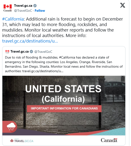 加拿大刚刚更新了针对美国的旅行提示,新增了多项警告,这可能会影响你即将前往美国的行程。 最新的旅行提示于2025年12月31日更新,美国整体风险仍维持在“采取正常安全防范措施”的标准等级。然而,本次更新强调了部分地区的新兴安全隐患,并提醒前往美国的旅客注意一些重要事项。 提示仍然关注长期存在的问题,例如美国的高枪支暴力率,以及许多州允许公开携带枪支的情况。 同时,提示指出,边境官员有权检查你的手机、笔记本电脑或其他电子设备,无需特定理由。如果拒绝检查,你可能会被拒绝入境。 ![]() 图源:globalnews 12月24日,提示首次更新时对加利福尼亚州发出警告,当地多县因恶劣天气宣布进入紧急状态。圣诞节前几天的暴雨引发了山洪、落石和泥石流,破坏了基础设施,并迫使部分社区撤离。受紧急状态影响的县包括洛杉矶、橙县、里弗赛德、圣贝纳迪诺、圣地亚哥和沙斯塔县。 部分地区仍处于主动撤离状态,当局警告,交通、电力、水、应急响应和医疗等基本服务可能会中断或完全无法使用。 暴风雨在假期期间使超过5万人断电,据BBC报道,至少有三人死于极端天气。加拿大政府在12月31日的X帖文中表示:“预计12月31日将有更多降雨,可能引发洪水、落石和泥石流。请关注当地天气预报并遵循当地官方指示。” ![]() 目前美国没有旅行禁令,美国整体风险等级未变,但此次更新提醒人们,极端天气可能会迅速改变当地条件。 其他值得注意的变化包括:如果计划在美国停留超过30天,需要向美国移民部门登记,否则可能面临罚款或下次入境被拒。12月31日,提示还更新了有关双重国籍公民的新规定。 截至2026年1月1日,美国根据“限制和限制外国公民入境以保护美国安全”的公告更新了受入境限制的国家名单。好消息是,加拿大公民,包括持有其他国家双重国籍的公民,只要使用加拿大护照旅行,不受影响。 ![]() 计划前往美国,尤其是加利福尼亚州的旅客,应仔细阅读完整旅行提示,并持续关注最新更新,以确保安全顺利出行。 |