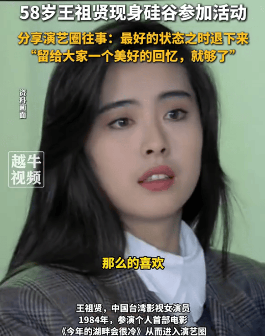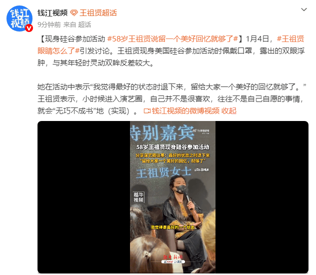 (来源:钱江视频) 1月4日,“王祖贤眼睛怎么了”引发讨论。王祖贤现身美国硅谷参加活动时佩戴口罩,露出的双眼浮肿,与其年轻时灵动双眸反差较大。 她在活动中表示:“我觉得最好的状态时退下来,留给大家一个美好的回忆就够了。”王祖贤表示,小时候进入演艺圈,自己并不是很喜欢,往往不是自己自愿的事情,就会“无巧不成书”地(实现)。