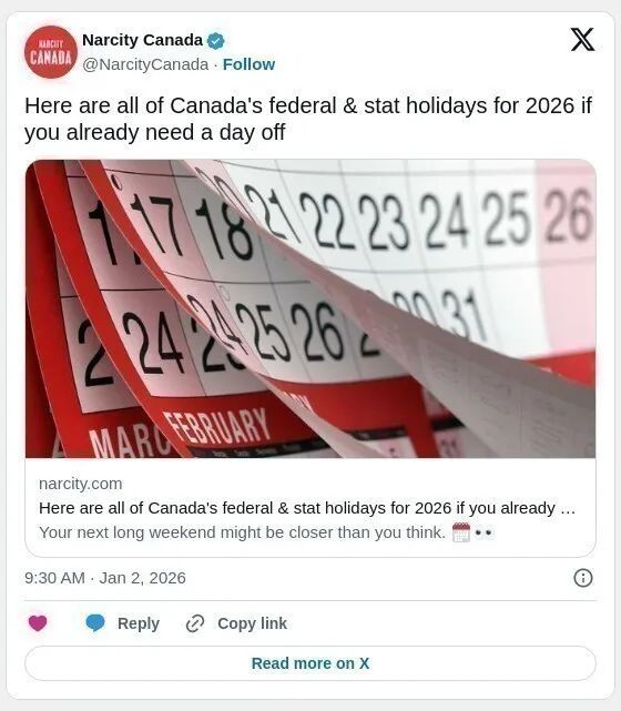 圣诞节是最后一个在所有省份和地区共享的法定假日,也是联邦假日,无论你在哪都放假。 12 月 26 日,星期六:节礼日(Boxing Day) 正式法定假日仅在安省,但也是联邦假日。今年落在星期六,雇主需安排补休(如星期四或星期一),让你享受延长假期。 以上就是加拿大 2026 年的完整法定假日清单。无论你是在计划假期还是只是想知道什么时候可以多睡一会儿,这份日历都值得收藏。 开始计划你的2026年长周末吧! ![]() |
