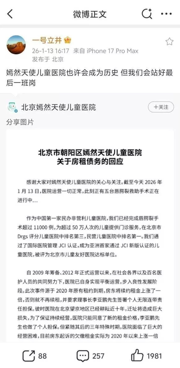 “嫣然天使儿童医院也许会成为历史,但我们会站好最后一班岗。”2026年1月13日,李亚鹏在社交平台转发了医院的官方回应,承认医院正面临房租债务危机。 ![]() 北京嫣然天使儿童医院在房租债务回应中提到,截至2026年1月13日,医院运营一切正常,此刻正有五台唇腭裂救助手术进行中。 2025年8月,李亚鹏被曝欠债总额已达1.8亿元,名下嫣然医院因未履行法律文书确定的义务,被列为被执行人,执行金额1381万元。事实上,不止嫣然医院,近些年,李亚鹏一直处在债务之中,他到底欠了多少债? 李亚鹏曾向当事人致歉:我不会逃避 嫣然天使儿童医院的房租债务问题,是李亚鹏债务危机的最新一章。 医院在2026年1月13日的回应中详细解释了债务形成过程:“此次债务问题系因‘2020年原有租约到期,房东将续约租金上涨了一倍,否则就不再续租,并要求理事长李亚鹏先生签署个人无限连带责任担保’。” 医院表示,为了保证持续经营,只能同意新的租金价格,李亚鹏也做了个人担保。但随后的三年特殊时期,医院面临了巨大的经营困难,目前房东起诉的欠缴租金实际为2020年以来上涨一倍租金的部分。 ![]() “如果按原合约租金,我们都已竭尽所能完成了支付。虽然面临重重困难,但我们仍积极与房东协商中,恳请租金能回归到目前合理正常的市场水平。”医院在回应中写道。 医院强调自己是一家非营利医院,是社会资产。自2009年筹备、2012年开业以来,已经完成唇腭裂手术超过11000例,为超过50万人次的儿童提供门诊服务,在北京市Drgs评分儿童医院中排名第三,民营儿童医院中排名第一。 2025年11月4日,北京市朝阳区法院已在北京嫣然天使儿童医院门口张贴公告,责令医院自公告日起30日内履行生效法律文书确定的义务,将北京市朝阳区望京东园519号楼交付申请执行人。 ![]() 图/北京嫣然天使儿童医院 据媒体报道,李亚鹏曾向当事人致歉。房东张先生说,直至现在,医院仍没有归还他的房屋。“考虑到他们是医院,所以第一期和第二期的租金,都低于市场价格。可现在,我的房子要不回来,租金要不回来,都这样不按照合同、法律办事,那我的损失怎么办?” 企查查显示,嫣然医院有两条作为被执行人的信息,涉案金额1381.59万元。李亚鹏于2023年还被北京市朝阳区人民法院限制高消费。 李亚鹏曾给张先生发过信息:“法院的判决收到了,就我个人的部分而言:我为医院做个人无限连带责任担保的事项情况属实,故我个人尊重判决并不会提起二审,但正如我去年就向您提过,这两年因为我公司的一起商业诉讼我一直是被执行人状态,我一直在努力还款中,但这两年环境确实不好,我用了两年把几百名公司员工的欠款及补偿还完,但外债目前还有数千万元。跟您说这些情况是想表达我个人担保的部分我不会逃避,但具体的偿还日期恐怕会有一个相当的过程。” “这几年我一直在四处寻求募款或公益机构接收,前后谈了将近十家都没有结果,现在有了法院的判决估计就更不太可能了。我不得不接受医院要成为历史这个事实,16年了,尽力了,不说了。最后向您表达歉意并祝平安健康!” 债务与慈善的撕裂:做医院 不是为了赚钱 李亚鹏的债务困境与他的慈善事业形成了复杂交织的局面。 2006年,李亚鹏与王菲的女儿李嫣出生,被确诊为先天性唇腭裂。为了给女儿治病,他不仅带她赴美接受多次手术,还联合王菲等8位创始人,于2012年成立“嫣然天使儿童医院”。 医院初期投入约1000万元人民币,定位为“救治唇腭裂及其他先天性疾病儿童”的专科医院。李亚鹏曾在采访中强调:“我们做医院,不是为了赚钱,是为了让更多孩子有机会像嫣儿一样,拥有正常的生活。” ![]() 图/年轻时的李亚鹏 然而,理想很丰满,现实却很骨感。医院运营成本高、患者支付能力有限,加上李亚鹏个人债务缠身,医院的资金链逐渐吃紧。 2025年8月,医院被列为被执行人后,网友评论:“当初为女儿治病有多拼,现在就有多狼狈。”“慈善需要钱,但更需要可持续的商业模式,李亚鹏显然没算清这笔账。” 李亚鹏曾公开谈论自己的财务困境。在《鲁豫有约》中,他坦言:“我不宽裕,6年没收入,只能靠借钱和过去的积蓄养家。”当鲁豫追问:“6年没收入,还要养家糊口,你有过担心吗?”李亚鹏脱口而出:“所以我离婚了。” ![]() 图/李亚鹏和女儿李嫣 尽管李亚鹏将离婚归咎于经济压力,但外界普遍认为,两人的婚姻早已因“性格不合”“事业方向差异”等问题出现裂痕。而王菲在与李亚鹏离婚后,迅速与谢霆锋复合,更被网友调侃“及时止损”。 债务源头雪山小镇项目崩盘 笔者梳理发现,李亚鹏的债务危机并非一朝一夕形成。 核心债务源于2013年11月,与王菲结束婚姻两个月的李亚鹏,以“中书控股董事长”身份高调进军地产界,在丽江束河古镇拿下408亩土地,宣布投资35亿元打造“雪山艺术小镇”。 项目定位为“中国首个体验式文化艺术商业综合体”,李亚鹏曾对雪山小镇有非常高的设想,还请来日本设计师隈研吾,为雪山艺术小镇量身设计了130多栋190平方米~300平方米的清水独栋别墅。 ![]() 图/丽江雪山艺术村(官方公众号) 凭借彼时的明星号召力,李亚鹏还吸引了杨坤、高圆圆、那英等圈内好友投资,更以“圈层营销”策略将190平方米别墅定价400万-500万元,单价远超当地市场水平。然而,开盘两年仅售出30余套别墅,销售惨淡暴露定位失衡。 2015年因