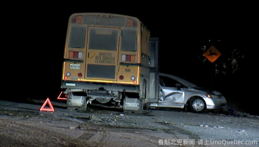 昨天深夜,魁北克省Montérégie 地区 Saint-Pie 发生一起交通事故,一名汽车司机在与一辆校车相撞后不幸身亡。 警方表示,Maskoutains 地区县级市政警队在接近午夜时接到事故报警。事故发生在 Route 235 公路、靠近 rang Elmire 一带。 魁北克省警(SQ)发言人、警官 Hugues Beaulieu 说,这名汽车司机疑似失去对车辆的控制,随后与校车发生碰撞。 Agence QMI 拍摄的画面显示,事故中,死者车辆右后侧承受了最严重的撞击。 幸运的是,校车上载有的年轻乘客无人受伤。