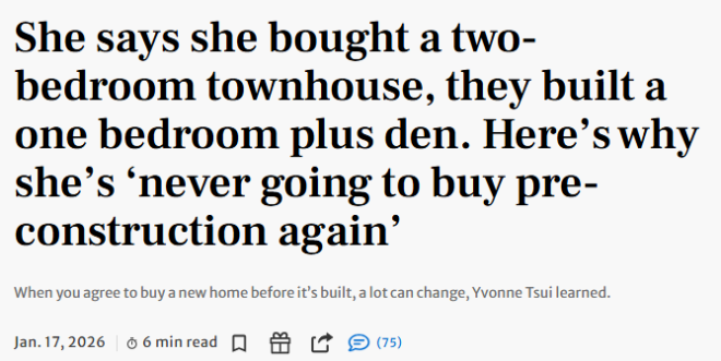维权进展缓慢 Tsui已经向安省新房消费者保护机构Tarion和安省房屋建造监管局(HCRA)提交投诉。目前,在该147单元的项目中,已有15起活跃投诉案件。 然而,维权进展极其缓慢。 Tsui于去年4月提交投诉,至今仍未看到实质进展。Tarion的调解会议甚至排到了今年5月。 她无奈表示,整个过程耗时漫长、结果不确定,而一些关键问题(例如户型调整)在合同中似乎被合法化。 “我感觉自己被所有本该为消费者提供制衡和保护的机构抛弃了。”她说。 另一位买家:这是一场“噩梦” 另一名买家Sean Lee也在同一项目中遇到类似问题。 他最初看中的是地段优势——靠近Don Valley Parkway、距离市中心不远,未来还有Eglinton Crosstown LRT站点。 2021年,他支付了20%首付(约17.6万加元)购买了一套两居室作为投资物业。 “结果变成了一场噩梦。”他说。他经历了长达14个月的入住期,每月支付数千加元,同时发现管理费大幅上涨——原本以为只需当前的一半,实际却高达约456加元/月。 开发商回应:归咎于疫情与融资难题 开发商Solotex Group的首席执行官Paul Goldfischer否认虚假宣传,坚称Tsui的单位是按合同中的“一居室+书房”方案建造的。 对于书房没门,他称这是设计师的建议,但如果业主坚持,将会补装。 他将项目延期归因于两点: 1. COVID-19疫情影响。2. 融资困难: 他点名了Fortress Real Developments公司,该公司本应提供融资但未能成行。值得注意的是,Fortress的两名负责人已于2025年5月因诈骗投资者被定罪。 对于买家在交割前需支付数月入住费的问题,他解释称,该项目由四个街区组成,靠近Victoria Park的两排先完工,后排仍在施工,因此只有整个项目完工后才能正式注册产权。 关于其他的费用,他解释说: