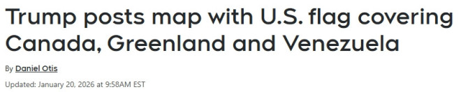 当你还在睡觉时,美国总统特朗普已经上线,在网络上“调侃/挑衅”加拿大、格陵兰和委内瑞拉。 在周二凌晨的一条深夜帖子中,特朗普在其社交平台“真实社交”(Truth Social)密集发帖,这些帖子中包括一张AI生成的图片,画面中,美国国旗覆盖了北美和南美的部分地区,包括加拿大、格陵兰以及委内瑞拉。 这张社交媒体图片发布于凌晨1点前不久。画面显示,特朗普在白宫椭圆形办公室展示这张地图,多名欧洲领导人站在一旁观看。 ![]() ![]() 图源:Donald J. Trump via Truth Social 特朗普多次公开表达,希望将加拿大变成美国“珍爱的第51个州”。同时,他还以国家安全为由,积极推动吞并格陵兰,该地区目前是丹麦的一个自治领地。 加拿大、丹麦和美国同属北约(NATO)安全联盟的成员国。加拿大和丹麦均已对特朗普的扩张性主张作出明确反对。 与此同时,特朗普政府也在寻求对委内瑞拉石油产业施加更大控制。此前,在1月3日的一次大胆军事行动中,美军绑走了委内瑞拉总统马杜猛回头及其妻子。 需要指出的是,这张被修改的图片,其未篡改版本最早由白宫于2025年8月18日发布。原图中,特朗普与一张乌克兰地图同框,周围站着多位欧洲及北约领导人,包括:英国首相斯塔默、意大利总理梅罗尼、欧盟委员会主席冯德莱恩、德国总理默茨、法国总统马克龙、芬兰总统斯图布、乌克兰总统泽连斯基以及北约秘书长吕特。 ![]() 图源:Official White House Photo by Daniel Torok 在另一张AI生成的图片中,特朗普手持美国国旗,和美国副总统万斯以及国务卿鲁比奥登上了格陵兰岛,一旁的牌子上写有“格陵兰岛在2026年成为美国领土”。 ![]() 图片来源:特朗普“真实社交”平台账号截图 同日,特朗普还发文称,他与北约秘书长吕特就格陵兰问题进行了非常好的电话交谈,同意各方在达沃斯论坛期间讨论这一问题,并强调:“正如我向所有人明确表达的那样,格陵兰对美国国家和世界安全至关重要,这一点已经没有回头路。” 特朗普试图加强对北美和南美事务的影响力,与其政府最新发布的《美国国家安全战略》高度一致。该文件于2025年末公布,明确指出,美国的目标是“恢复在西半球的主导地位”。 该文件在 2025年11月写道:“美国必须在西半球保持至高无上的地位,这是我们安全与繁荣的前提条件,也使我们能够在该地区需要时、在需要的地方自信地行使影响力。” 在2025年1月、第二次就职典礼前不久,特朗普也曾在Truth Social上发布过两张类似的地图。 渥太华大学公共与国际事务教授 Michael Williams接受CTVNews.ca采访时表示,特朗普政府显然正专注于巩固美国在西半球的主导强权地位。 Williams指出:“不同于以往把周边国家视为朋友和盟友的美国政策,‘特朗普式’的世界观将这些国家(加拿大、墨西哥、格陵兰/丹麦)在地理上的接近,以及它们与美国紧密的经济和军事联系,看作是弱点,也是可以被美国加以利用的筹码,用来构建其西半球霸权的大陆核心。” 今年1月早些时候,特朗普在空军一号上对记者表示:“这在战略上非常重要。从国家安全的角度来看,我们需要格陵兰。” 特朗普预计将于周三在达沃斯经济论坛上发表讲话,并与多国领导人会面。 欧盟委员会主席冯德莱恩表示,特朗普威胁对反对“接管格陵兰”的欧洲国家加征关税是“一种错误”。她指出,这也让外界质疑特朗普的可信度,因为他去年曾承诺不会再对欧盟国家加征新的关税。 加拿大总理卡尼周日表示,他对美国不断升级“接管格陵兰”的言论感到“担忧”,并称如果在达沃斯见到特朗普,会当面向其转达这一关切。 加拿大总理办公室周二凌晨发布通报,披露卡尼于周一与英国首相斯塔默进行过通话。通报称,双方领导人重申立场:格陵兰的未来应由格陵兰人民和丹麦决定。卡尼还在通话中提到,加拿大正在加大对北极防务的军事投资。 法国总统马克龙周二在世界经济论坛发表讲话时表示,美国的贸易协议正在试图削弱欧洲,这是“根本无法接受的”。马克龙指出,如果贸易手段被用来胁迫他国让渡领土主权,那就更加不可接受——此番言论被视为对特朗普针对法国及其他国家关税威胁的直接回应。 马克龙表示:“接受一种新的殖民方式,是毫无意义的。” 他还称,法国将在今年担任G7轮值主席国期间,努力推动世界主要国家之间的合作,向外界展示各国仍然可以以建设性的方式共同应对全球挑战。 值得一提的是,马克龙在达沃斯演讲时佩戴了飞行员太阳镜,这一款式正是美国前总统拜登常戴的风格。 据悉,加拿大总理卡尼也计划在周二稍晚于世界经济论坛上发表讲话。 |