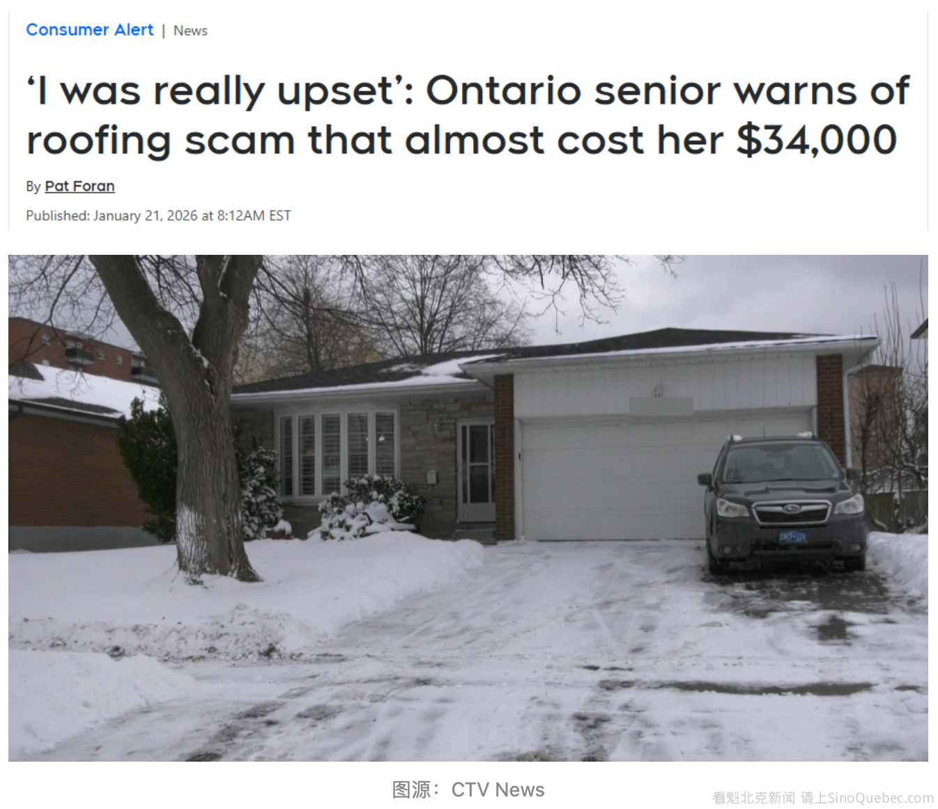 近日,大多伦多密西沙加(Mississauga)一名老妇站出来讲述自己的经历——她差点在一宗屋顶维修诈骗中被骗走3.4万加元。 这名老妇名叫Leslie Bentley。她在接受CTV新闻采访时说:“我一开门,那名男子就说,‘我看你家屋顶该修了,我们正好在附近,可以帮你处理。’” Bentley表示,事情发生在新年前不久。当时,一名自称是屋顶工人的男子敲响了她家的门,说她家的屋顶需要维修。她也知道屋顶的瓦片确实有些老化,于是当对方表示可以帮忙更换时,她就同意了。 “他告诉我,必须先付给他7,000加元现金,”Bentley说,“于是我就去了银行,把钱取出来给了他。” 据Bentley回忆,那名男子爬上屋顶后又告诉她,屋顶状况非常糟糕,还需要她再多付27,000加元。 “他说屋顶已经烂了,”她说,“他说屋顶烂了、屋架也烂了,整套都得换掉。我当时真的快哭了,心里特别难受。” 不过,在她再掏钱之前,Bentley给女儿Tracy打了电话。 “我马上回消息跟我妈说,‘千万别再给他们钱,我不确定这些人是不是正规公司,’”Tracy Bentley对CTV新闻说。 Tracy还表示,她的哥哥随后爬上屋顶,当面质问这些所谓的屋顶工人,让他们指出哪里“腐烂”了,但根本看不出任何问题。 “一点都没烂,”Tracy说,“状况很好,除了需要换瓦片,其他什么毛病都没有。” Tracy和哥哥一开始追问细节,那些人就立刻慌忙离开了。 “我们往窗外一看,工人没了,面包车也没了,全都跑了,”Tracy 说。 Bentley一家向CTV新闻提供的监控视频中,可以看到Bentley把钱交给的那名男子。对方自称来自一家名为“24 Hrs Roofing and Masonry”的公司。 CTV新闻随后多次致电该公司,但接电话的人两次直接挂断电话。CTV通过该公司网站发送的邮件,也一直没有收到回复。 Bentley表示,之后她不得不另找一家正规公司来重新铺设屋顶瓦片。 她说,虽然自己很后悔已经交出了7,000加元,但也庆幸没有再被多骗27,000加元,并把这一切归功于孩子们的及时提醒。 “我真的很庆幸自己有这么主动、警觉的儿子和女儿,”Bentley说,“要不是他们,我真不知道现在会怎样,大概会少了2.7万加元吧。” 家属表示,他们已经向皮尔区警方(Peel Regional Police)报案。 |