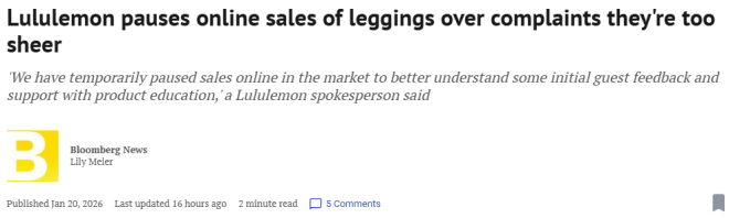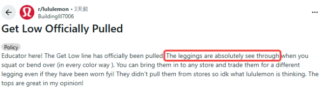 曾经的“中产收割机”、瑜伽裤界的“爱马仕”——Lululemon,最近又翻车了! ![]() ![]() 图源:51记者拍摄 就在几天前,Lululemon刚刚高调推出全新的“Get Low”深蹲系列瑜伽裤,结果没过多久,吐槽就铺天盖地地来了。 不少消费者发现:别说Get Low了,连“正常下蹲”都不敢。 ![]() 图源:reddit 顾客纷纷抱怨,这款瑜伽裤完全不“防走光”,在下蹲或弯腰时完全是透的(所有颜色都一样),尴尬到不行。 ![]() ![]() 图源:Reddit 随后有人发现,截至1月16日,也就是新品发布仅3天后,Get Low系列已经从Lululemon官网“消失”了。 Lululemon发言人随后回应称,Get Low系列目前仍在门店销售,但线上销售已被暂时叫停。 ![]() Lululemon发言人表示:“我们已暂停北美的线上销售,以便更好地了解顾客的初步反馈,并加强产品相关说明。我们预计不久后将把该系列重新上线,其他购买渠道目前不受影响。” 受此消息影响,Lululemon股价在当天一度下跌6%,创下自去年9月以来的最大单日跌幅。 ![]() 图源:reddit 值得一提的是,这已经是Lululemon至少第三次因“服装质量不过关、产品性能不达标”而被消费者集体吐槽了。 大约18个月前,Lululemon推出的Breezethrough系列,也是在刚上市不久后就被紧急撤下,原因是消费者反映版型不好,既不好看也不好穿。 而再往前追溯到2013年,Lululemon还曾因为经典的黑色瑜伽裤过于透光,直接大规模召回,并向顾客提供全额退款。这次失误也给品牌留下了相当尴尬的一笔。 事实上,这家昔日的资本宠儿日子并不好过。 过去一年,Lululemon股价已累计下跌近50%。 与此同时,公司高层也是一团乱。目前,公司正面临首席执行官(CEO)空缺的尴尬境地,同时还在与创始人Chip Wilson进行“内斗”。作为大股东的Wilson长期公开炮轰公司现有的管理层,并试图重组董事会。 你还在买Lululemon吗?是否也觉得它现在的质量大不如前?欢迎在评论区聊聊。 |