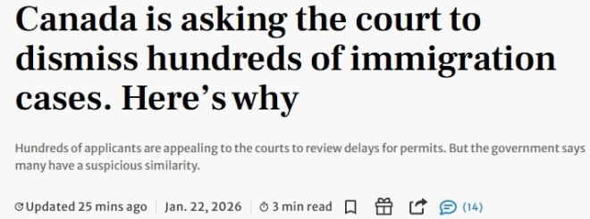 加拿大政府已向联邦法院提出申请,要求一次性驳回数百宗移民案件,并指这些案件涉嫌由未获授权的“幽灵中介”统一操作。 移民部长在上月提交的动议中指出,这430份因移民审理延误而向法院申请救济的案件,在法院文件中存在明显异常:格式、写法和措辞高度一致,应合并审理并整体驳回。 相关申请人均声称是自行出庭(self-represented),但政府发现,他们共用相同的住址、电话号码和电子邮箱,高度可疑。 ![]() ![]() 该案件涉及来自中国的申请人,他们申请的是留学、工作或访问签证。他们请求法院审查各自案件的处理延误情况,并在认定延误不合理的情况下,下令移民部门加快审理进度。 政府指控“幽灵中介”操盘《多伦多星报》报道称,不良“幽灵中介(ghost agents)”的存在,长期以来一直是移民官员和法律监管机构面临的难题。这类中介通常在幕后操作,难以被追责,其不专业行为不仅可能给申请人带来严重后果,也可能被用来滥用移民与司法体系。 近来,移民官员似乎加大了对未授权代理人介入申请的识别力度,并开始以追究申请人责任的方式进行震慑。去年,多起锡克族难民申请因可信度不足而被标记并驳回,原因是其陈述内容“几乎一字不差”。 政府对其数据库进行分析后发现,在2023年1月至2025年11月期间提交的这430宗“强制令(mandamus)”申请,即请求法院命令政府官员履行职责,全部使用相同的联系方式,但却声称由申请人本人自行提交。 按照法律规定,当事人只能自行出庭,或由持牌律师或依法授权的人士在联邦法院代表其出庭。政府之所以对这些案件提出挑战,是因为认为申请人向法院作出了不实陈述;政府并未对其所遭遇的移民审理延误本身提出异议。 政府还指出,法院有责任确保其规则得到遵守,并确认所有出庭或准备法律文件的人,均为合法授权的法院执业人员。 移民律师Max Berger表示,司法部试图将多达430宗申请合并,并以程序异常为由予以驳回,这种做法将是“前所未有”的。 根据他对政府动议的审阅,其中一些申请人的强制令申请“本身完全站得住脚”,例如有一名访客签证申请人已等待 498 天。但他也指出,显然所有申请文件都是“出自同一人之手”,法院有权因这些程序异常而驳回案件,并认定申请人存在欺诈行为。 Berger说:“非常有意思的是,司法部并没有利用这些模板化语言去攻击申请内容本身,而只是用它来证明,这些申请不可能是由不同的人独立准备的。” 他还指出,移民官员在拒签信中本身就大量使用模板语言。他质疑,如果这些申请是由一名律师代理、只是恰好使用了同一模板,政府是否还会发起同样的挑战。 移民相关案件已占据联邦法院工作量的绝大部分。近年来,新移民诉讼数量激增: