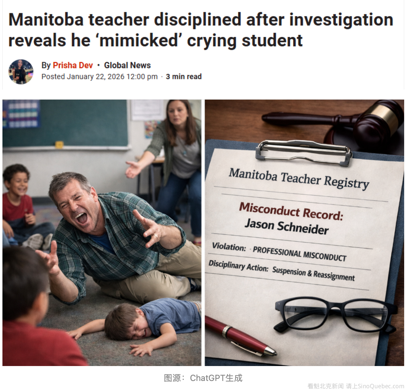 去年,加拿大曼尼托巴省一名教师在涉及低年级学生的课堂事件后,承认职业不当行为。近日,该案已被公布在省内公共教师登记册上,该登记册自去年起实施。 教师背景与事件概述教师Jason Schneider自1996年起持证任教。根据曼尼托巴省教师职业行为专员(Commissioner of Teacher Professional Conduct)发布的协议,Schneider在2025年4月发生在他负责的3/4年级混合班的事件调查后被纪律处分。 事件涉及一名9岁学生,该生需要额外的学习和行为支持,而教师事发时已知晓这一情况。根据协议事实陈述,2025年4月29日,该学生因在课堂游戏中提前被淘汰而情绪激动并哭泣。当学生躺在地上挥动手臂时,Schneider模仿了(mimicked)学生的动作、手势和表情。其他学生也跟着教师做,直到一名教育助理介入并要求他们停止。 调查与纪律处分事件发生后,Louis Riel学区于2025年5月12日向专员报告了Schneider的行为,调查随即展开。协议还列出了Schneider当天对其他学生的言语行为: 一名根据支持计划在课堂外开始上学的学生找不到铅笔时,Schneider批评说:“如果上学更规律,就能更好地保管好自己的东西。” 对一名仍在学习英语的学生,他质疑其语言能力,并指示学生继续完成作业。 事件发生当日,学区已将Schneider置于行政休假状态,直到调查结束。2025年5月,学区发出信函,决定对Schneider: 停职5天且无薪 调任至另一所学校及岗位 强制接受额外培训并进行密切监督 调查还发现,Schneider职业生涯中有过多次纪律处分记录。 承认不当行为与后续要求Schneider承认协议中列出的事实,并认可其行为构成《曼尼托巴教育管理法》下的职业不当行为。根据同意协议,他的教师证书仍有效,但附有条件: 必须完成针对情绪管理、包容性、沟通能力、情商及冲突解决的专业发展课程 课程完成证明必须在3月底前提交 在决定纪律处分时,专员考虑了多个因素,包括: 对学生造成的情绪伤害 Schneider未能营造积极课堂环境 行为对公众对教育体系信心的影响 公共教师登记册与新制度该协议已公布在曼尼托巴教育与早期儿童学习部的认证教师和学校临床人员在线登记册上,该登记册自2025年1月起生效。公共登记册允许任何人按姓名搜索,查看教师证书是否被停职或吊销。 中加教育的差异 在一些华人的眼里,像Jason Schneider这样的老师,可能是一位“严师”,善于管教学生,有助于帮助学生养成良好的学习习惯,会受一些家长的欢迎。在中国的传统教育观念里: 老师模仿、纠正孩子的行为,或者用“夸张”方式让学生意识到自己的错误,有时会被认为是幽默又严格的教学手法 比如老师用夸张动作演示“不好习惯”,提醒学生注意纪律、专注学习,很多家长甚至会觉得这是有助于孩子规范行为 只要出发点是教育而不是羞辱,通常会被认为是负责任、严格、能管班的好老师 但在加拿大和很多西方国家,教育理念强调: 尊重孩子的个人权利和情绪感受 禁止教师做可能让孩子感到羞辱或情绪受伤的行为 哪怕老师只是“开玩笑”或“示范”,如果学生感到被嘲笑或伤害,也可能被认定为职业不当行为 换句话说,这不是单纯的“严格教学”能解释的,而是文化差异 + 法规与职业标准的结合。对此,各位华人怎么看呢? |
