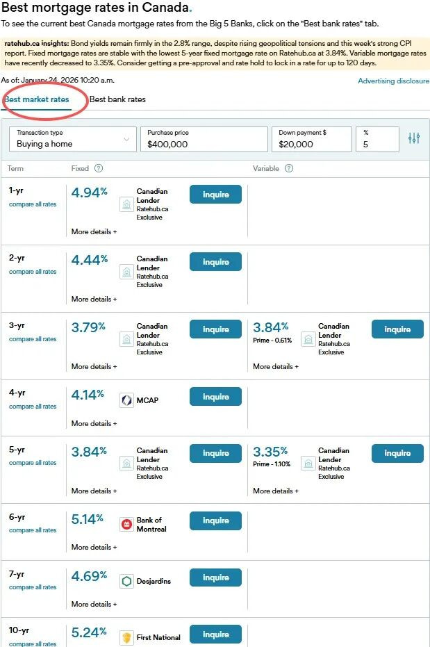 在加拿大房贷市场中,五年期固定利率贷款一向被视为较稳妥的选择。不过,专业人士反映近期三年期房贷最受欢迎。 根据《环球投资者》的报道,来自 Tango Financial 的房贷经纪人 Victor Tran 表示,最近三年期房贷如今反而更受购房者青睐。 他透露,最近 10 位客户中有 9 位选择了三年期贷款。 ![]() 三年期利率更具谈判空间 Tran 指出,部分贷款机构在短期房贷利率上拥有更大的议价余地,尤其是针对贷款金额约 80 万加元或以上的客户。 Tran 说:“对于这些大额贷款,我在三年期固定利率上能拿到更好的价格”。 他表示,虽然贷款机构为何在三年期上更愿意让利并不总是透明,但确实有大型贷方近期持续提供折扣。 适合短期出售或再融资的客户 除了利率优势外,三年期房贷也因其灵活性而受到欢迎。 Tran 解释,许多计划在几年内出售房产或进行再融资的客户,希望降低提前解约罚金的风险,而三年期贷款更容易满足这一需求。 以下是来自 Ratehub.ca提供的截止今天的银行和市场的抵押贷款利率数据。如需查看今日各类期限/类型的抵押贷款利率完整列表,请访问 ratehub.ca/best-mortgage-rates。 ![]() ![]() 三年期房贷曾因“降息预期”走红 事实上,三年期房贷在两三年前也曾流行,但原因不同。2022 与 2023 年,许多客户选择三年期固定利率,是基于利率即将下降的预期,希望在续约时获得更低利率。 ![]() 这一判断最终被证明正确。Tran 表示,目前的房贷利率已回到过去几十年间的正常水平区间。 |