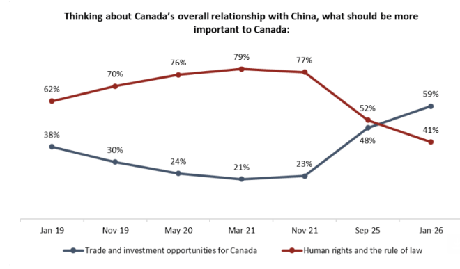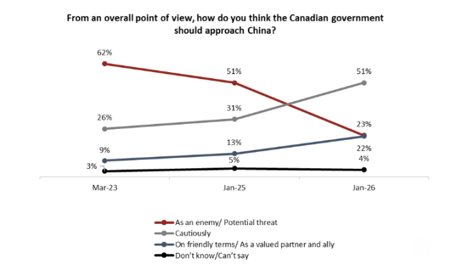 政治经济关系并非零和博弈,国家关系也在不断变化。2026年最明显的例证之一,就是在与美国传统经贸合作基础变得不稳定之际,加拿大重新加强与中国的接触。卡尼访华后最新民调显示,65%加拿大人支持对华贸易,22%反对。 ![]() 图源:globalnews 非营利机构安格斯里德研究所(Angus Reid Institute)的最新数据显示,加拿大人和政府一样,比近年更加开放地看待与中国的经济合作机会。 数据显示,认为加拿大应将中国视为“敌人”或“威胁”的比例,已从2023年的62%大幅下降至23%。与此同时,认为应以“谨慎接触”方式处理中加关系的人数,从26%翻倍增长至51%。另有22%的人认为应将中国视为“朋友或盟友”。 ![]() 长期以来,中国在人权问题上的争议,一直影响着加拿大对华政策。这一议题在两名加拿大人——康明凯(Michael Kovrig)和迈克尔·斯帕弗(Michael Spavor)被中国拘押长达1019天期间及之后,受到更大关注。 ![]() 图源:globalnews 从2019年至2022年,绝大多数加拿大人表示,如果必须在两个优先事项之间做出选择,他们更希望加拿大关注中国在人权和法治方面的记录,而非追求贸易和投资机会。 ![]() 到2025年,随着特朗普关税威胁令加拿大人感到不安,这一比例几乎持平。而如今,在卡尼自2017年以来首次以总理身份访问中国之后,59%的加拿大人将经济因素放在优先位置。 ![]() 对于卡尼签署的这项协议——加拿大降低中国电动车关税,并将允许进口数量提高至49,000辆,作为交换,中国降低对多种加拿大农产品的关税——认为这是好协议的人数是认为不好的人数的三倍(65%对22%)。受影响可能最大的萨斯喀彻温省和安省居民也大多持相同看法。 ![]() 其他关键发现加拿大人对中国的好感度比去年1月上升了11个百分点,从16%升至27%。不过,自10月以来并无进一步变化,说明此次访华并未明显改变公众态度。 ![]() 2021年3月时,在保守党、自由党、NDP或魁人政团(Bloc Québécois)支持者中,认为应优先贸易和投资而非人权与法治的比例不超过26%。而如今,在所有这些群体中,持这一观点的比例都不低于49%。 |