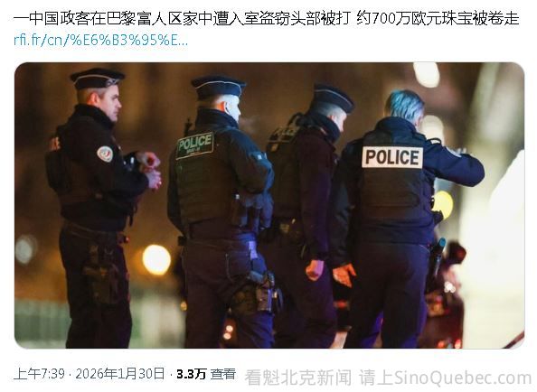 综合法媒报道,一名中国官员在巴黎十六区家中遭遇入室盗窃和袭击,窃贼卷走了价值约700万欧元的贵重物品。据法国商业调频电视台从警方消息人士处获悉,这起入室盗窃案发生在周五凌晨,地点位于巴黎十六区。 报导指,两名男子于凌晨5点左右闯入该中国官员的住所。检方补充说,这两名男子使用钥匙进入住宅,这构成法律规定的加重情节。事实上,警方接到报案称发生了一起“非强行入室盗窃”。 据警方消息人士透露,犯罪分子洗劫了公寓,盗走了手表和其他贵重珠宝。多方消息来源称,被盗物品的估价约为700万欧元。据检方消息,这位中国政客声称自己在睡梦中遭到袭击,随后被送往医院。一位警方消息人士称,袭击者击打了他的头部,然后带着赃物逃离现场。 《费加罗报》报导指,事发时,这位中共党员被窃贼惊醒,窃贼袭击了他,然后抢走了他的珠宝。该报从警方消息人士处获悉,中共经济部一名官员于周五凌晨在巴黎遭遇入室抢劫,此消息证实了法国LCI电视台的报道。 凌晨4点30分左右,两名蒙面男子闯入位于塞纳河畔、巴黎十六区肯尼迪总统大道的一栋建筑。犯罪分子爬到六楼,通过通往阳台的落地窗进入了受害者的公寓。巴黎检察官办公室已对此案展开调查,并澄清说,虽然没有强行入室,但“不当使用钥匙属于盗窃罪的加重情节”。 据检方称,窃贼在洗劫房屋时,盗走了十块名表、胸针和钻石首饰,估计价值数百万欧元。检察官办公室已将此案移交巴黎警察局司法警察第一区,并通知了巴黎警察局司法警察下属的打击匪帮犯罪大队(BRB)。 《费加罗报》的警方消息人士透露,更精确的估价在600万至700万欧元之间。受害者被噪音惊醒后,遭到窃贼袭击,头部被击打,随后窃贼带着赃物从建筑物内院逃走。这位中国官员已被送往位于巴黎十五区的乔治·蓬皮杜欧洲医院。他的额头上有一道5厘米长的伤口。 据悉,其生命没有危险。该受害者预计出院后会报案。据他所说,没有敏感数据被盗。两名蒙面窃贼目前仍然在逃。目前无法确认上述报道中的所谓中国官员指的是人大代表、政协委员还是中国政府经济部门的官员。