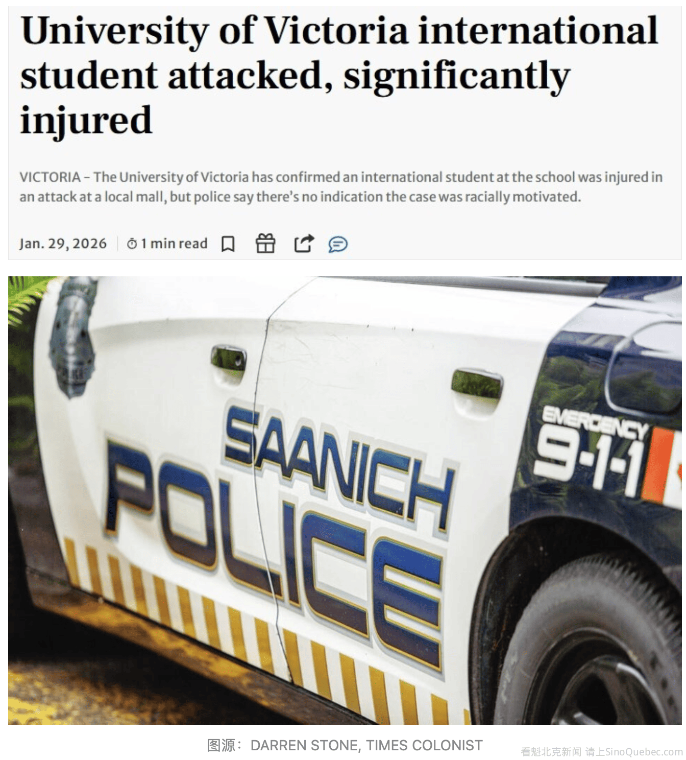 维多利亚大学(University of Victoria)证实,该校一名国际学生在当地一家商场遭到袭击并受伤。警方表示,目前没有迹象显示此案具有种族动机。 不过,校方在声明中表示:“仇恨、种族主义和不容忍在本地社区没有立足之地”,并强调学校致力于建设“多元、安全且充满活力的校园及更广泛社区”。 卑诗省Saanich警方周三表示,袭击发生在1月22日晚9点30分前,当时巡逻警员接到报告称,在 Tuscany Village购物中心附近有人遭到袭击。 警方称,受害者面部受到了严重伤害,被送往医院救治,但关于袭击的更多细节尚未公布。 调查人员正在调查这起袭击事件的具体情况,并已确认嫌疑人为一名20多岁至30岁出头的白人男子。 维多利亚大学学生事务副校长Jim Dunsdon证实,受害者是该校的一名国际学生,并表示学校已与其取得联系,正在提供支持。 “这是一宗令人震惊的事件,我们的心与正在从伤势中恢复的受害者同在,”Dunsdon在声明中说,并提醒学生注意周围环境安全。 “听到这样的事件令人痛心,尤其是当受害者来自我们社区时。” 他还表示,校内外均提供相关支持项目,帮助那些因这起事件而受到影响的人。 不过,另一份校内通告则给出了不同说法。 根据《Times Colonist》获得的一封校内邮件,维多利亚大学生物系主任Doug Briant在周一发给教职员工和学生的备忘录中,将这起袭击描述为随机发生且具有种族动机的攻击。 备忘录中写道:“我写这封信是为了提醒大家,上周四晚在校外发生了一起令人震惊的事件。” “正如你们中有些人可能已经听说的,我们生物系的一名国际研究生在Tuscany Village 附近遭到随机袭击,这似乎是一宗带有种族动机的攻击。” Briant 在备忘录中写道,这名学生已接受治疗,正在从伤势中恢复,并得到了同学及系里同事的支持。 该备忘录并未说明为何认为这起袭击可能具有种族动机。 Briant表示,由于警方仍在调查中,他无法透露更多细节。 校方则将有关此事件的进一步询问转交给Saanich警方处理。 |