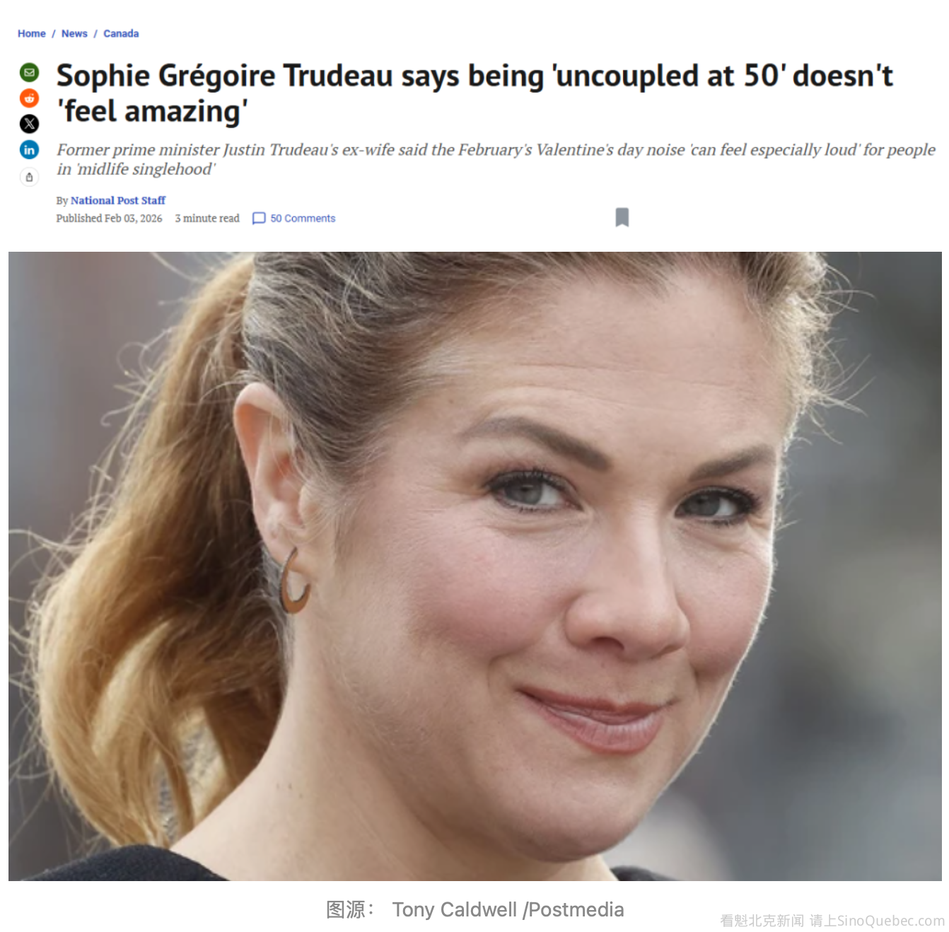 在情人节前夕,苏菲·格雷瓜尔·特鲁多(Sophie Grégoire Trudeau)向粉丝和关注者分享了一段相当私人的感悟,谈到自己在50岁时处于“uncoupled(单身)”状态,以及如何适应“中年单身”带来的挑战。 “好吧,我承认。从表面上看,在情人节这天,50岁单身,真的谈不上感觉多好,”她在周六发布的一期通讯中写道。 根据心理咨询机构Center for Integrative Change的解释,“uncoupling”,也常被称为“有意识地分开”,指的是一种平和、尊重彼此地结束一段恋爱或婚姻的方式,而不是充满冲突和怨恨的分手。 众所周知,苏菲于2023年8月与前总理杜鲁多分居。两人结婚18年,育有三个孩子:18岁的Xavier、16岁的Ella-Grace,以及11岁的Hadrien。目前尚未就法律层面的离婚发布任何公开声明。 在这封文字中,去年4月刚满50岁的苏菲提到,2月这个充满爱情与浪漫提醒的月份,对中年单身人士来说,“往往显得格外喧闹”。 她建议读者试着跳出这些表象,即便这并不容易。“中年单身并不是失败。很多时候,它更像一次重新校准——当外界的噪音安静下来,我们终于能再次听见自己的声音。” 这是她与杜鲁多分开公开后,度过的第三个情人节。 当两人分开的消息公布时,媒体随后报道称、并最终得到证实,她当时已经与渥太华的一名儿科外科医生Marcos Bettolli博士发展出恋爱关系,时间点可能早于分居消息对外公开。 在Bettolli前妻Ana Remonda提交的离婚申请中,她指控他已经“与一位高度曝光、备受媒体关注的人重新建立伴侣关系,这也带来了重大的安保考量”。 苏菲在文中还写道,男性和女性从小就被“有时温和、有时严厉地”训练去调整自己,以换取被接纳。作为一名自助类作家和心理健康倡导者,她表示,很多人最终会长期处于一种情绪上的“高度警惕,而非放松自在”状态。 她进一步指出,自爱始于看清这些被社会条件塑造出来的障碍和行为模式,并主动去拆解它们、改变情绪习惯。“自爱是一种练习。它的核心是安全感,而安全感来自当下的存在感,”她写道。 虽然苏菲今年情人节仍是单身,但她的前夫并非如此。 杜鲁多目前正在与美国流行歌手凯蒂·佩里(Katy Perry)交往。这段恋情据传始于去年夏天在蒙特利尔,随后在圣诞节前夕两人正式在社交媒体上“官宣”,关系才得到确认。 双方都没有公开谈论过这段感情。 在这段关系尚停留在“目击传闻”阶段时,苏菲曾在加拿大女企业家Arlene Dickinson的YouTube节目中被问及此事。她坦言,“事情确实会影响到我们”,但她选择不让自己一直被触发情绪。 “你如何回应事情,是你自己的选择,”她说,“我想在这一切中成为怎样的女人,也是我自己的选择。” 在接受Yahoo Canada的另一场采访时,她表示,媒体所说的,和她真实的生活之间是有差别的。 “如果我选择让那些东西来定义我,我就会迷失自己,”她说,“这不仅适用于我,也适用于地球上的每一个人。如果你让外界来定义你,你就失去了真正认识自我的那份神圣感。” |