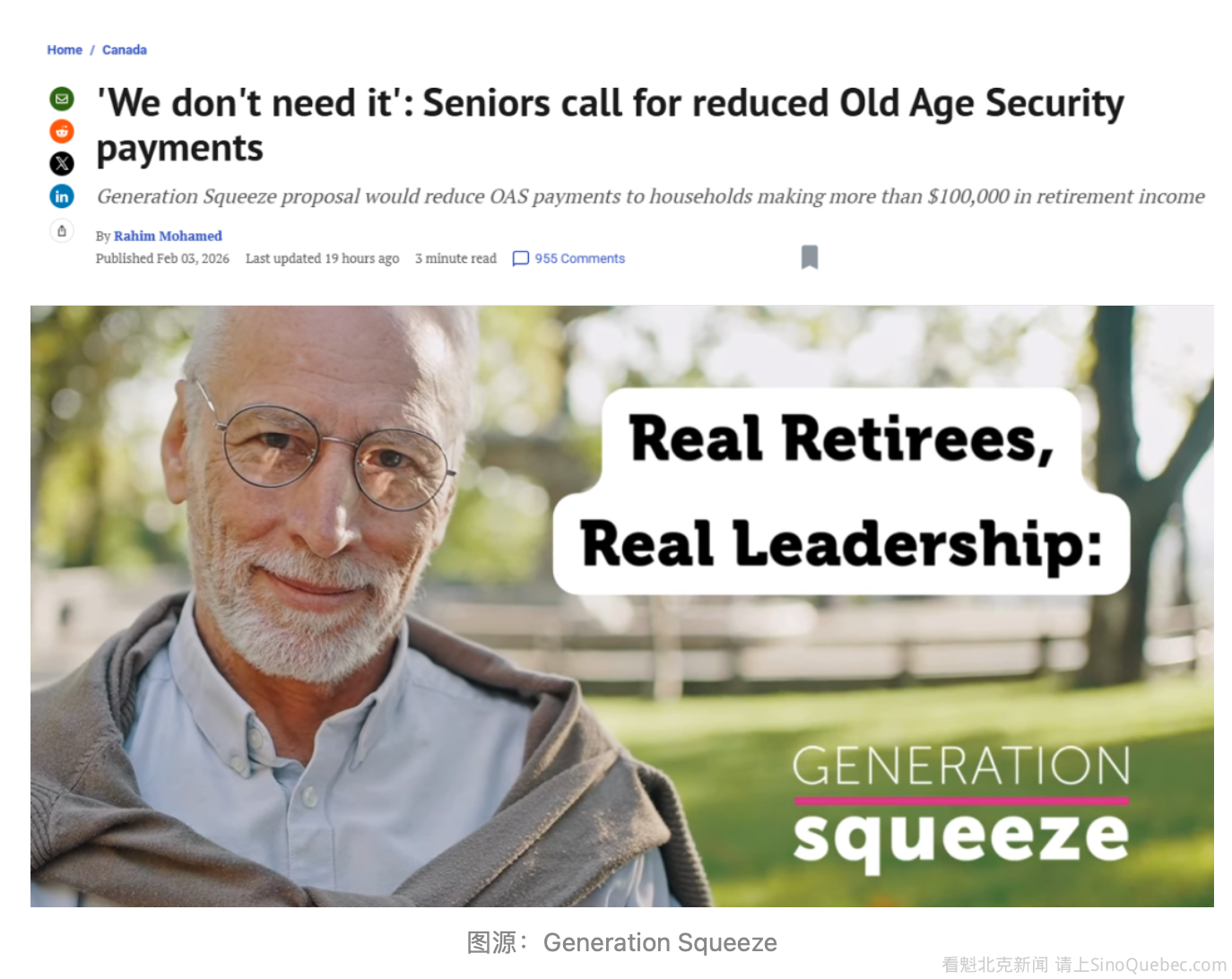 加拿大还是好人多啊! 据National Post报道,一群生活宽裕的退休老人正在呼吁加拿大政府缩减他们的老年保障金(OAS),理由是他们不需要这笔钱,反而可以用于其他更紧迫的优先事项。 倡导组织Generation Squeeze近日发布的一段视频中,共有11名退休老人分享了自己对OAS的看法。 “我领老年保障金,我完全不明白为什么会这样,”Harry Grossmith说。他是视频中的11名退休老人之一。“我不穷,也不拮据,可我每个月仅仅因为年纪大就拿到一笔额外收入,这对我来说没意义。” 同样出镜的退休老人Victor Grosstern补充道:“我们不需要,也不想再领OAS了。” 这段视频是为了宣传Generation Squeeze的提案:对退休收入超过10万加元的家庭减少OAS支付。该组织表示,这项改革每年可释放70亿加元的联邦支出。 按照现行规定,收入高达182,000加元的退休夫妇,仍可能领取全额每年18,000加元的OAS。 目前,OAS是加拿大成本最高的联邦项目,每6加元联邦开支中就有1加元花在OAS上。2025-26年,OAS总开支达到855亿加元,预计到本世纪末,每年将超过1000亿加元。 Generation Squeeze负责人Paul Kershaw周二在渥太华的媒体简报会上表示,在地缘政治高度不稳定、经济不确定的时期,政策制定者无法忽视不断膨胀的OAS成本。 Kershaw对记者说:“在这样的时刻,国家韧性不仅仅依赖军事和外交,更取决于我们的财政政策是否稳健、可靠、面向未来。” 他指出,政府在11月的联邦预算中提出780亿加元赤字,这是COVID-19大流行之外的最大赤字。 他表示,“现代化”目前偏向高收入群体的OAS系统,可能是比政府现在全面开支削减和裁员更温和的替代方案。 Kershaw说:“这项政策,因为它规模最大,可以让我们走上稳定财政基础、投资政府优先项目的道路。” Generation Squeeze还主张逐步取消两项老年人税收抵免,他们表示这样每年可为加拿大人额外节省70亿加元,加上OAS改革,总共可释放更多资金。 出现在视频中的退休老人Beth Jefferson表示,她是在2021年听到Kershaw在播客中讨论代际公平后加入该组织的。 Jefferson说:“我退休得比较早,当时在寻找自己想要投入时间和精力的地方……女儿给我推荐了那个播客。” 她补充说,她一直关注税收不公平的问题。她表示自己坚信‘社会应公平分配同情心’,并指出儿童及残障福利的回扣起始时间,比OAS更早。 Jefferson说:“我们每个人以不同方式努力工作,得到的回报也不同,而政府在征税上真的不公平。” 退休协会:这会削减中产福利 加拿大退休人员协会(Canadian Association of Retired Persons)会长Anthony Quinn指出,Kershaw是在利用少数慷慨退休者的善意,为一项削减中产阶级加拿大人OAS的政治议程做“掩护”。 Quinn说:“Kershaw用庞大的总数字让OAS看起来奢侈,但对个人而言,每月也只是约700加元的应税收入。他所设想的‘节省’,并非来自像视频中这些宽裕退休者的福利削减,而是来自削减数百万中产阶级退休者的福利——这些人一生缴税,现在依赖OAS来支付食品、房租、药物和取暖费。” Quinn表示,他支持关闭那些允许极少数真正富裕退休者通过调整收入申报获得OAS的漏洞,但他补充说,这远不能与削减让数百万加拿大老年人维持生计的OAS项目相比。 |