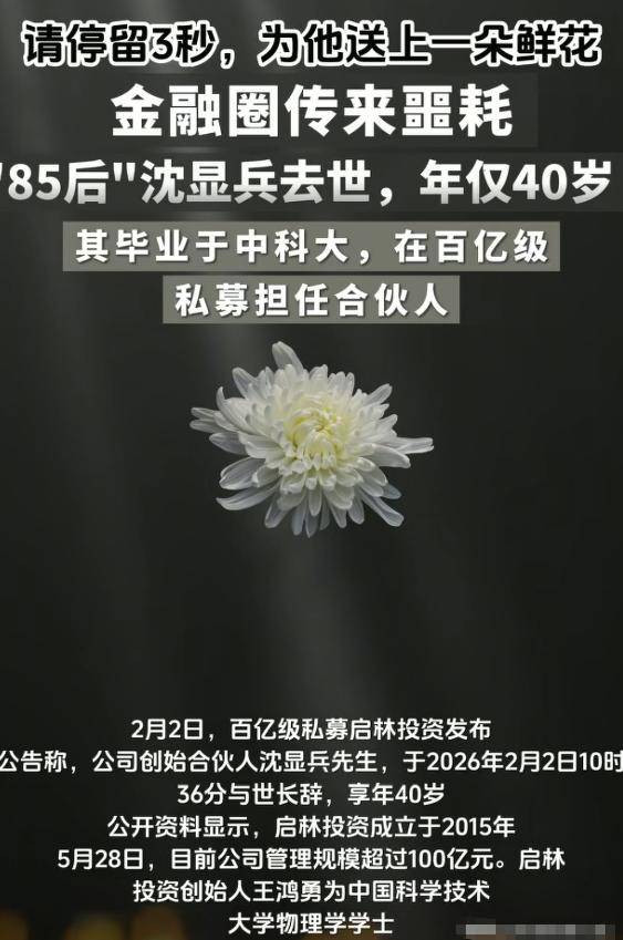 2026年2月2日上午10点36分,启林投资发出一则讣告,说联合创始人沈显兵去世了,40岁,时间地点身份都写清楚了,就是没提怎么走的。 这在金融圈很少见,一般总会带上一句“突发疾病”或“意外”,这次连这类话都没有用上,大家看到后第一反应是感觉不对劲。 这次离世的沈显兵,他1986年出生在湖北,毕业于中国科学技术大学物理学专业,之前还在科大讯飞等知名企业待过。 2015年和两位中科大校友一起创办了启林投资,是公司核心创始人之一。 这家公司刚成立时,就只有他们三个人的小团队,一步步打拼下来,如今管理规模已经突破150亿元,在量化投资圈里妥妥的是响当当的标杆。 作为创始合伙人,沈显兵的持股比例达到23%,还一手管着公司的运营管理,是行业里公认的实干家。 40岁的年纪,正是事业最巅峰的时候,突然离世本来就够让人意外的了,再加上讣告里这个反常的留白,难怪大家会忍不住多想,各种猜测很快就传开了。 更巧的是,沈显兵离世前没多久,全球黄金白银市场刚经历了一场史诗级暴跌,时间刚好在1月30号到31号。 ![]() ![]() 那段时间,国际黄金价格直接暴跌9.25%,盘中一度跌穿4700美元/盎司,最低摸到了4682美元/盎司。 国内的沪银期货更狠,直接跌停,现货白银价格盘中最大跌幅甚至达到35.89%,不少散户和小机构一夜之间亏得血本无归,这两天也被圈内称作“黑色星期五”。 ![]() 两件事凑到一起,网上的猜测一下子就炸了锅。 有人说他在2025年底到2026年初,曾公开表示白银估值处于历史低位,后续有望反弹。 ![]() 于是就有传言说,沈显兵这次是重仓了黄金白银,赶上价格暴跌,一下子亏了好几个亿,扛不住这么大的压力才出的事。 还有人说得更具体,称他当时加了高杠杆交易,价格暴跌后直接爆仓,资金缺口填不上,最终酿成悲剧。 ![]() 这些猜测越传越广,毕竟沈显兵在量化投资圈声望不低,启林投资又是行业头部机构,他的突然离世本就牵动人心,再加上刚好撞上罕见的贵金属暴跌行情,难免让人把两者绑在一起。 但也有人表示,启林投资主要做的是股票量化投资,投的都是中证500、中证1000这些宽基指数,行业分布特别分散,风控做得很严,不会把钱都押在黄金白银上。 ![]() 金银大跌那几天,启林的产品几乎没受影响,所谓爆仓的说法根本站不住脚。 并且,沈显兵的同事和朋友透露,他常年泡在办公室搞研发,每天就睡三四个小时,过年都在优化投资策略。 ![]() 量化投资靠的是模型和速度,竞争对手都在拼研发,稍微慢一点就可能落后,所以从业者大多长期处于高压状态。 虽然没提死因,但也没必要过度猜测,逝者已矣,我们更该记住的是沈显兵为行业做出的贡献。 ![]() 他和团队搭建的多策略体系,让启林投资在市场波动中保持稳定收益,还被不少同行借鉴;他推动的严格风控理念,也为行业树立了标杆。 沈显兵的追悼会在2月4日举行,不少圈内人都会去送他最后一程。 愿他一路走好,也希望这件事能让更多人明白,健康永远是人生的第一位,别等失去了才后悔。 ![]() |