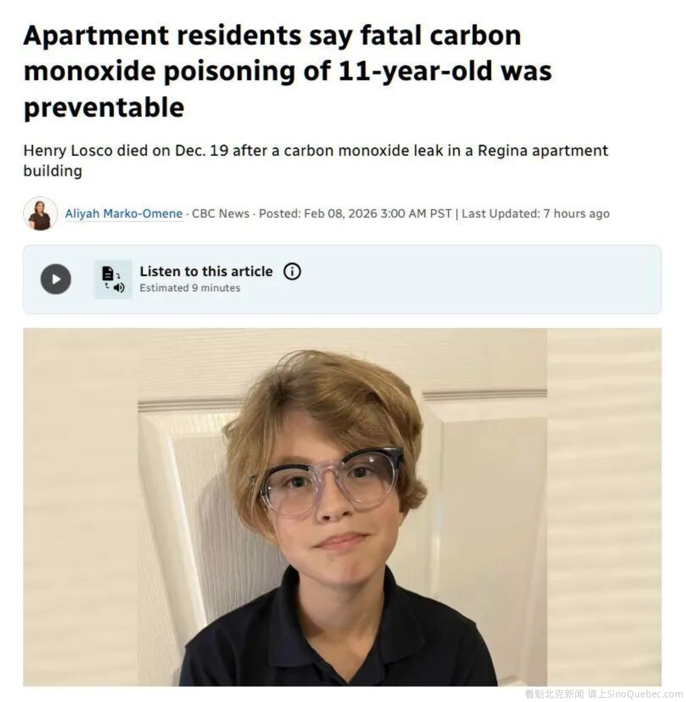 位于里贾纳公寓楼里一名11岁男孩(是该楼的租户)因为一氧化碳中毒死亡。 一名住在这栋公寓楼的男子称,就在公寓楼里这名11岁男孩死亡的几个小时前,他公寓单位里的一氧化碳探测器响了起来。 该男子表示,当天下午早些时候,警报响起,他联系了维修人员,被告知“打开窗户,拿个风扇过来”。 加拿大广播公司没有透露该男子的姓名,因为他害怕因公开此事而遭到报复。 该男子称,12 月 19 日,一名维修工花了一些时间试图弄清楚是什么原因导致 公寓楼的探测器发出警报 。 “他指示我打开窗户……他的推测是,有人在外面吸烟可能导致烟雾探测器发出警报”,该男子说道。 11岁的亨利·洛斯科 (Henry Losco)在数小时后因一氧化碳中毒身亡。 他的父亲塞尔吉奥·洛斯科说,亨利当天早些时候感到不舒服,便去他们家四楼公寓的床上躺了下来。 他再也没有醒来。 一氧化碳,简称CO,被称为“无声杀手”。它是一种无色、无味、无臭的气体——不借助探测器根本无法识别。 一氧化碳探测器发出警报的男子表示,他后悔当初没有督促维修人员采取更多措施。他认为亨利的死原本是可以避免的。 对所发生的事情感到质疑的并非只有他一人。 现在,该大楼的部分租户要求得到解释和问责。 该大楼的业主通过其律师拒绝了加拿大广播公司(CBC)的采访请求,并且没有回复CBC的提问。该大楼的维修工也没有回复CBC的提问或采访请求。 这场悲剧对亨利的母亲玛丽娜·希尔斯打击很大。 “我儿子去世后,我就不是以前的我了”,她说。“他已经不在这个世界上了,我想我永远也无法接受,因为他还是个孩子,孩子不应该死去”。 一件本可以预防的事 亨利去世当天晚上 8 点前几分钟,医护人员希瑟·尼亚正在公寓套房里玩电子游戏放松身心,当她意识到发生了什么事时,立即采取了行动。 “我听到了尖叫声”,尼亚说,她跑到走廊,看到邻居希尔斯正在试图抢救脸色苍白、身体僵硬的亨利。她拨打了911,让希尔斯和警察通话,自己则接手了心肺复苏。 她一直试图帮忙,直到医护人员赶到接手。几天后,尼亚才得知亨利没能活下来。 “发生这种事真是太可怕了”,她说。 “这本来是可以避免的,因为我在整栋楼里跑来跑去的时候,没有听到任何警报……什么动静都没有”。 她要求大楼管理方给出解释。 加拿大广播公司新闻获得的电子邮件显示,尼亚曾多次联系公寓的管理团队,询问为什么该建筑的许多一氧化碳探测器在 12 月 19 日没有发出警报,以及为防止再次发生悲剧,已经采取了哪些措施。 她写道:“我强烈建议大楼在每间公寓都安装一氧化碳探测器”。 在她发出第一封电子邮件近三周后,管理团队才做出回应,向她保证一氧化碳探测器已安装在建筑物内“需要的地方”。 他们还补充说,业主“愿意”和她谈谈。 1月27日,她与阿尔伯特街大楼的业主马克·弗伦茨对峙,并录下了他们的对话。 在录音中,弗伦茨表示,关于亨利去世当晚究竟发生了什么,仍然存在疑问。 他说,这栋楼在夏天安装了两台新锅炉,并于 12 月 18 日投入使用——也就是亨利去世的前一天。 “所以萨斯喀彻温省技术安全局(TSASK)……他们检查了锅炉,确保一切正常,确认无误后签字确认。他们说一切都很好”,弗伦茨说。 TSASK 负责测试和验证锅炉系统是否高效、安全并符合制造商的规格。 TSASK 证实,12 月 18 日,他们确实在 Metro 1827 大楼。该机构表示,这两个锅炉安装正确,并且“按照制造商的规格”运行。 报告称,当天两台锅炉的内部系统运行正常。 1 月 30 日,里贾纳消防局长莱恩·杰克逊表示,一氧化碳泄漏是由“锅炉的严重故障”造成的,包括 TSASK 在内的多机构调查正在进行中。 消防队长莱恩·杰克逊就12月19日发生在萨斯喀彻温省里贾纳市的致命一氧化碳中毒事件的调查进展进行了最新通报。一名11岁男孩在公寓楼内中毒身亡,他的父亲伤势严重,已被送往医院。 弗伦茨告诉尼亚,锅炉投入使用的第二天,“其中一台锅炉发生了内部爆炸”。他在录音中说道。“所以一氧化碳进入了建筑物”。 弗伦茨说,他晚上 8 点左右接到电话,到达大楼时,所有人都正在疏散。 在录音中,他说他已经询问消防部门,他还能做些什么来确保该建筑物采取适当的安全预防措施。 当天晚些时候,在尼亚的公寓里安装了一氧化碳探测器。 消防队长在 1 月 30 日表示,他无法提供关于致命事故发生后消防部门是否建议在该建筑物内采取额外安全措施的详细信息;他也无法说明该建筑物是否“符合规范”。 加拿大广播公司新闻部请求采访弗伦茨,并向他提供了一份详细的采访问题清单。但他拒绝了采访。 弗伦茨的律师伊恩·麦凯表示,由于多项调查仍在进行中,他目前不会提供评论或更多细节。 租户自行购买探测器 住在三楼的苏珊·瓦西里申表示,悲剧发生后,她不敢再冒险。她亲自购买了三个一氧化碳探测器,现在都安装在家里。 她说,泄漏当天她病得很重,眼前发黑,记忆力也出现了断断续续的情况。她的猫也病了,兽医后来证实它们是一氧化碳中毒。 住在Metro 1827三楼的苏珊·瓦西里申表示,她相信那天带猫去看兽医救了她的命。 瓦西里申表示,12月19日当天,她套房内的CO探测器从未发出警报。她说,事发前后,大楼维修人员都没有来检查过她房间的警报系统。 萨斯喀彻温省所有公寓楼都必须安装一氧化碳探测器,但并非每个单元