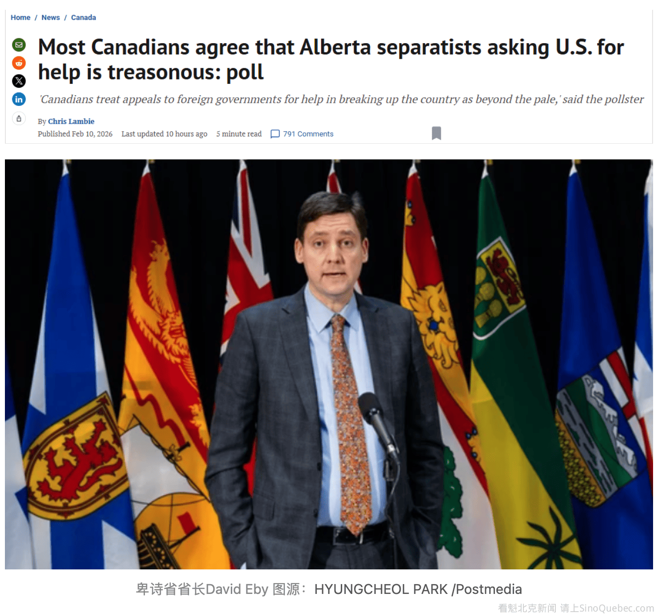 根据Canada Pulse Insights的一项最新民调,71%的加拿大人认同卑诗省省长戴维·埃比(David Eby)近日的表态:“去一个外国,请求协助分裂加拿大,这种行为有一个老掉牙的词可以形容,那就是叛国。” 这项调查是在有关阿尔伯塔繁荣计划(Alberta Prosperity Project)领导人——一个推动这个能源大省独立的分离主义组织——自去年春天以来三次在华盛顿会见美国政府官员的说法曝光后进行的。该组织称,他们正试图争取一条5000亿美元的美国信贷额度。 “我的感觉是,总体而言,加拿大人认为向外国政府求助、以分裂国家为目的的行为是不可接受的。这实际上是一条红线,大多数人都准备把它称为叛国,”Canada Pulse Insights首席执行官约翰·赖特(John Wright)在近日的采访中表示。 尽管受访者事先被告知,阿尔伯塔繁荣计划的行为并不符合《刑法》中对叛国或煽动叛乱的定义,但萨斯喀彻温省和马尼托巴省的受访者最有可能同意埃比的说法(82%),其次是大西洋地区(78%)、安大略省(77%)、卑诗省(75%)、魁北克省(63%)以及阿尔伯塔省(56%)。 65岁及以上的加拿大人最有可能认同埃比关于叛国的评论(79%),年收入低于9.9万加元的人群中也有较高比例表示同意(74%)。 全国范围内,29%的受访者不同意埃比的叛国说法,其中阿尔伯塔省比例最高(44%),其次是魁北克省(37%)、卑诗省(25%)、安大略省(23%)、大西洋地区(22%),以及萨斯喀彻温省和马尼托巴省(18%)。 35至54岁的加拿大人(36%)以及年收入超过10万加元的人群(35%)最有可能不同意这一说法。 民调还显示,81%的加拿大人认同埃比的另一项表态:“试图削弱加拿大,向外国势力请求协助分裂这个国家,是完全不恰当的。” 卑诗省居民最支持省长关于“外国势力”的说法(86%),其次是安大略省(83%)、大西洋地区(83%)、萨斯喀彻温省和马尼托巴省(82%)、魁北克省(78%)以及阿尔伯塔省(69%)。 54岁以上的加拿大人最有可能在这一点上支持埃比(86%),女性(82%)以及年收入低于5万加元的人群(83%)也更倾向于同意。 19%的加拿大人不同意埃比的这一观点,其中包括31%的阿尔伯塔人,其次是魁北克省(22%)、萨斯喀彻温省和马尼托巴省(18%)、安大略省(17%)以及卑诗省(14%)。54岁以下的成年人(23%)和男性(21%)最有可能持反对意见。 “在阿尔伯塔,基本上有三分之一的人对此表示反对,”赖特说。“我不知道这是否意味着,如果举行公投,会有三分之一的人因强烈不满而出来投赞成票。相关的辩论还没有真正开始。” 超过半数受访者(53%)不同意阿尔伯塔省省长丹妮尔·史密斯(Danielle Smith)的说法,她曾表示:“认为我们仅仅讨论一个独立的阿尔伯塔会是什么样子就构成叛国,这是企图压制言论自由的绝望做法。” 安大略省(58%)和卑诗省(57%)的受访者最可能不同意史密斯的说法,其次是大西洋地区(50%)、魁北克省(49%)和阿尔伯塔省(45%)。 女性(57%)、拥有高等教育背景的人群(56%)以及34岁以上的加拿大人(56%)更倾向于反对史密斯的这一表态。 略低于一半(47%)的加拿大人同意史密斯关于“压制言论自由”的说法,其中阿尔伯塔省比例最高(55%),其次是魁北克省(51%)、大西洋地区(50%)、萨斯喀彻温省和马尼托巴省(45%)、卑诗省(43%)和安大略省(42%)。 尽管多数人不同意史密斯在上述问题上的观点,但大多数加拿大人认同她的另一项表态:“我不会妖魔化或边缘化一百万名同胞,他们的确有合理的不满。” 59%的加拿大人支持这一观点,其中阿尔伯塔省居民最可能表示同意(64%),其次是萨斯喀彻温省、马尼托巴省、魁北克省和大西洋地区(均为62%),以及卑诗省和安大略省(55%)。民调显示,18至34岁的加拿大人(65%)和男性(60%)最支持这一看法。 “这里确实存在一定的同情,”赖特说。“人们不希望领导人一笔勾销或污名化那些愤怒到开始试探分离主义想法的公民。加拿大人期待领导人解决根本性的不满,而不仅仅是谴责最极端的表达方式。” 41%的受访者不同意史密斯关于“合理不满”的说法,其中卑诗省和安大略省比例最高(45%),其次是萨斯喀彻温省、马尼托巴省、魁北克省和大西洋地区(均为38%),以及阿尔伯塔省(36%)。根据民调机构的数据,55岁及以上的加拿大人在这一点上的反对态度最为明显(46%)。 大多数加拿大人(72%)认为,总理马克·卡尼(Mark Carney)在1月29日主持各省省长会议后,“正在团结加拿大,而不是分裂加拿大”。 魁北克省居民(75%)最认可这一点,其次是卑诗省(73%)、安大略省和大西洋地区(72%),以及阿尔伯塔省、萨斯喀彻温省和马尼托巴省(67%)。 仅有28%的加拿大人持反对意见。在阿尔伯塔省、萨斯喀彻温省和马尼托巴省,这一比例略升至33%,其次是安大略省和大西洋地区(28%)、卑诗省(27%)和魁北克省(25%)。35至54岁的加拿大人最可能持这种看法(37%)。 “关于马克·卡尼的数据非常引人注目,”赖特说。“在进入这场关于阿尔伯塔分离的辩论之前,他已经拥有巨大的政治资本。” 这项在线民调于1月29日至2月2日期间对1510名加拿大成年人进行了调查,数据根据人口普查基准进行了加权。若采用同等规模的概率随机样本,其误差范围为正负2.5个百分点,在20次中有19次成立。 |