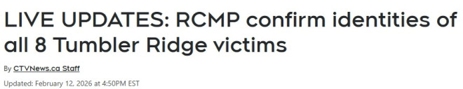 卑诗省Tumbler Ridge今日沉浸在哀悼之中。就在一天前,18岁的Jesse Van Rootselaar在一处住宅及附近学校开枪,造成8人死亡,随后自尽,约25人受伤。 ![]() ![]() 皇家骑警公布遇难者名单皇家骑警(RCMP)已确认遇难者身份。 Tumbler Ridge中学遇难者: