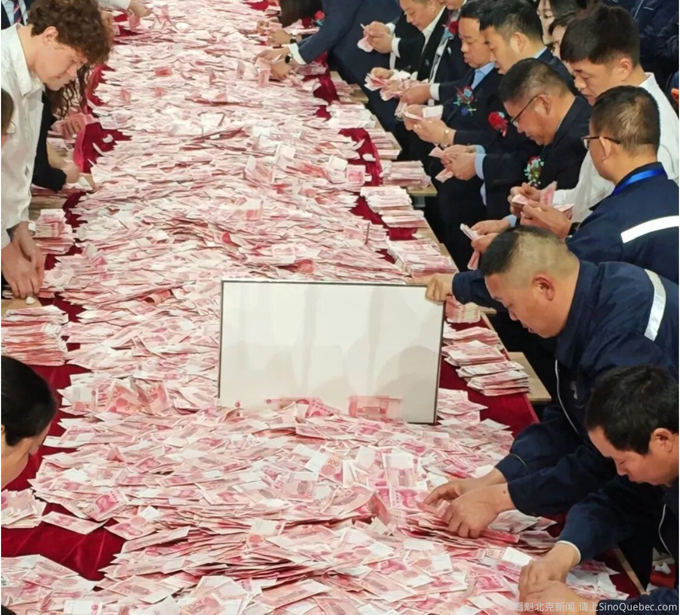 2月13日,“全网最爱发钱老板”河南省矿山起重机有限公司创始人、党委书记、董事长崔培军召开企业年会。据了解,企业去年累计盈利2.7亿元,这次年终奖将发给员工1.8亿元,再创新高,三分之二的利润都将分给员工。 年会现场发放6000万元现金,供员工参与数钱环节。极目新闻记者从现场获悉,有人在10分钟内数了9.1万元,有员工表示数钱数到手软。数钱环节结束后,崔培军在现场发言并向企业员工鞠躬致谢,倒满一整杯杜康酒敬各位员工。 极目新闻记者在年会现场获悉,颁奖表彰环节过后,进入最令人激动的数钱环节。崔培军表示,当天到场的都有份,现场现金有6000万元,“希望员工多数一点,既讲究数量,又要讲究质量,待会啥都别想,就想着数钱,多数点。” 年会现场专门摆放了40台点钞机,为数钱环节提供辅助。百元大钞在长桌上铺满,一线员工代表在一旁蓄势待发。计时开始后,上台员工代表专注点钞,台下全体员工纷纷加油鼓励,氛围欢快热烈。不同年限的一线员工,分为5分钟、10分钟和15分钟三个组别。 数钱规则为:限定时间内,不得借助任何工具,时间一到需立即停止数钱。计数结束后,参与员工需向现场服务人员上报自报数钱数量并签字确认,随后前往验钞机区域进行核验,自报数量跟验钞机核验数量一致,即可全部拿走。规则明确“错一罚十”,即数错一张扣十张对应现金,最终金额按核减后的余额计算。数钱活动以班组为单位开展,所得款项由班组全体人员平均分配;任何形式的作弊行为,将直接取消参与资格,计数结果作废。 倒计时结束后,员工代表停止数钱,点钞机开始核验。极目新闻记者从现场了解到,有人10分钟数了9.1万元,经核验后,多数了两张,可以带走8.9万元,有员工表示数钱数到手软,数完之后崔培军又宣布再加300万。 数钱环节过后,崔培军在现场发言并向企业员工鞠躬致谢,称14日是情人节,所以想让员工带着配偶过来聚餐,“感谢集团几千名员工,可以这样团结努力,多发五百是五百,能帮一点是一点,再次感谢集团的每一位员工,勇敢去闯,本人及公司都支持员工去闯”。崔培军还提醒大家,现金为王,不要过度消费。 |