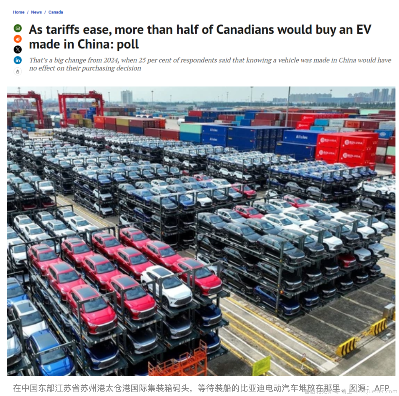 随着总理马克·卡尼(Mark Carney)下调对中国电动车进口的关税,一项最新民调显示,加拿大人对购买中国制造电动车的态度明显变得更开放。 根据 Nanos Research Group 为彭博社(Bloomberg News)进行的一项最新调查,超过一半的加拿大人(53%)表示,如果知道某辆电动车是中国制造,这不会影响他们的购买决定。另外有15%的人表示,中国制造会让他们更愿意购买;28%的人则表示,这会让他们更不愿意购买。 相比2024年,这一态度变化相当明显。当时有61%的加拿大人表示,他们不太可能购买中国电动车;只有25%的人表示不会影响决定;仅9%的人表示,如果是中国制造,反而更愿意购买。 加拿大人对中国制造商态度的缓和,发生在美国对外加征关税、以及前总统特朗普频频威胁进一步加税的一年之后。加拿大是美国制造汽车最大的出口市场。 2024年,在时任总理杜鲁多(Justin Trudeau)执政期间,加拿大曾对中国电动车加征额外100%的关税,基本上等于阻止其进入加拿大零售市场,此举与美国当时的政策保持一致。 随后,中国也对加拿大农产品(包括油菜籽)加征关税作为反制。不过,上个月卡尼访问北京期间改变了这一政策。他宣布,每年最多允许4.9万辆中国电动车进入加拿大市场,关税大幅降至约6%。作为交换,中方表示将取消对加拿大食品加征的关税。 虽然最初的配额可能会被一些加拿大消费者已经熟悉、价格相对较高的车型占据,比如在中国工厂生产的特斯拉(Tesla)车型,但卡尼政府希望未来能逐步引入价格更低的电动车。政府表示,与中国达成的协议中还规定,部分配额将预留给售价不超过3.5万加元(约2.57万美元)的电动车。 与此同时,联邦政府近期还宣布计划恢复电动车购车补贴,每辆车最高可达5,000加元,并承诺为行业制定新的排放标准。 此外,政府也希望吸引中国企业投资加拿大汽车制造业。 目前,加拿大汽车业正努力应对特朗普关税带来的压力。联邦工业部长梅拉妮·乔利(Melanie Joly)表示,政府的目标是推动中国企业与加拿大公司成立合资企业,在加拿大设立组装工厂。 她在接受彭博社采访时表示:“我们相信,这些优秀的加拿大企业可以与中国电动车公司合作,打造一款‘中加合资’汽车,并出口到全球市场。” 这项由 Nanos 进行的民调于1月31日至2月4日期间通过电话和网络方式访问了1,009名加拿大人。在19次调查中有20次,其误差范围为正负3.1个百分点。 |