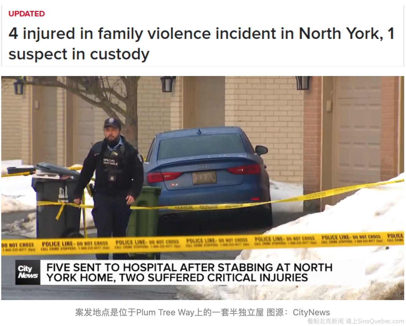 今年的Family Day和除夕刚好在同一天,昨晚应该是家庭团聚,分享快乐的好时光。然而,有一家人却发生了悲剧。 周二晚间,在北约克发生一起被多伦多警方称为“与家庭有关的暴力持刀伤人事件”。多伦多警方表示,他们在晚上9点45分左右接到报警,称在Bathurst Street与Steeles Avenue一带发生“不明状况”。 警方到场后发现四名伤者,伤势程度不一,随后被送往医院。四人均遭到刀刺伤。一名男子在现场被捕。 急救人员向 CityNews 表示,他们共将五人送往医院——其中四人有伤,另有一人被送医接受评估检查。 两名男子(23岁和26岁)遭受严重刀伤;两名女子(51岁和29岁)伤势不危及生命。53岁的嫌疑人本人没有受伤。 警方确认,这五人均为同一家人。 该嫌疑人被控三项严重袭击罪(aggravated assault)、三项持武器袭击罪(assault with a weapon),以及一项造成身体伤害的袭击罪(assault causing bodily harm)。 他原定于周二上午出庭。 警方表示,目前不再寻找其他嫌疑人,并称为了保护受害者身份,不会公布被告姓名。 有周围邻居表示:“这是一个安静的社区,突然听到这样新闻,真的令人感到害怕。因为,你知道的,我们都有孩子,这真的是太可怕了!” 另一位不愿露脸的邻居表示,她虽然不熟知这家人,但是在街上偶有遇见时会打个招呼,“这真的是令人心碎,让人难以相信。” |