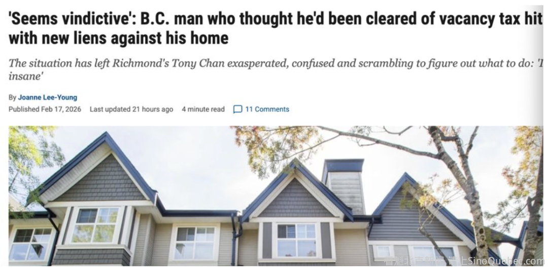 据《温哥华太阳报》2月17日报道,一位列治文华裔居民几年前曾因投机和空置税而遭受损失,但后来这些指控被撤销。他说,省政府又对他的房产提出了新的留置权。 这起案件让陈先生感到恼火、困惑,并焦头烂额地想办法解决。 “太离谱了,感觉像是报复,”在列治文同一处房产住了25年的陈说。“我不知道为什么。难道是办事员办事太过分了吗?” 卑诗省新民主党政府于 2018 年推出了这项投机和空置税,作为对主要城市地区空置或未充分利用的住宅物业征收的附加费。 政府过去曾表示,该税的“主要目的不是为了增加收入”,而是为了“帮助根除投机行为,并阻止失控的房地产市场中出现空置房屋”。 陈先生于2000年在列治文购置了房产。五年后,他与一位在美国生活和工作的女士结婚。 2021年,陈先生收到了一张14920美元的账单。当时,陈先生已基本从投资行业退休,但他的妻子仍在工作,而且收入比他高。 税法将他定义为卫星家庭的成员,因为他家庭申报收入的更多部分是在加拿大境外赚取的。 但陈先生辩称,他用在卑诗省工作挣的钱购买了这处房产。在他当时64岁的年纪中,有62年都居住在卑诗省,从16岁起就在那里工作并缴纳所有适用的税款。 陈先生公开了自己的遭遇后表示,他于 2022 年与财政部的约书亚·麦卡锡进行了交谈,麦卡锡同意他不应缴纳投机空置税,并解除了政府因他未缴纳税款而对其房产设定的三项留置权。 “我告诉他我的情况,他说:‘陈先生,如果您是加拿大公民,您在加拿大纳税,您住在这里,您不是空置房屋的人,您可以免税。’我说:‘嗯,我的情况一直都是这样。’” 土地所有权文件显示,是麦卡锡在 2022 年 8 月取消了陈的房产上的三项留置权。 陈以为事情就此结束了。 但2024年8月,陈说:“他们再次决定将我定性为投机者,因为我们的‘全球收入’并非来自BC。因此,我又陷入了这种恶性循环。” 2024年7月,政府对陈的房产设置了新的留置权,这次金额接近100,970元。上个月,又增加了一项有效的留置权,金额超24,000元。 “我并没有多余的 125,000 元可以随意支配,这意味着我必须卖掉房子,搬出卑诗省。” 陈先生表示,他已联系省议员屈杰冰寻求帮助。屈在一份声明中表示,她已在省议会提出此事,并尝试直接向财政部长申诉,但尚未收到任何回应。 “陈先生不是投机者,他也没有让房屋空置。他是一位长期居民,为社区做出了贡献,现在却因为政府政策僵化和不合理地执行而受到不公平的惩罚。” 财政部在一份声明中表示,根据法律规定,它不能对与个人有关的税务信息发表评论。 投机和空置税是按年征收的,因此,如果税款未缴清,房产每年都可能被留置。 陈先生说,他和妻子为重组家庭,两人各自抚养与前任伴侣所生的孩子。妻子的收入没有用于他住了25年的房子。 他向财政部长布伦达·贝利传达的信息是:“如果投机税的设立是为了帮助卑诗省居民,那么将其错误地应用于我身上是完全不恰当的。作为所有卑诗省居民的守护者,一旦您意识到此类附带的、意想不到的后果,您就有责任防止其发生。” 他在一封发给贝利的电子邮件中打趣道:“如果我是个投机者,那我真是个糟糕的投机者,因为我只有一套房子,而且我已经住了25年了。我无法解除我的婚姻。” 一位朋友建议陈先生联系律师,但他还没有采取这一步骤。 他说:“我既无力支付追究此事所需的未知金额,也无力承担政府对我征收的罚款和税款。”