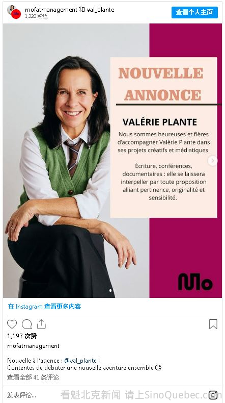 前蒙特利尔市长Valérie Plante加入了艺人经纪公司MoFat,表示离开政界后愿意接受新的职业挑战。 Plante 在 Instagram 上宣布,将由 MoFat 协助她开展创意与媒体项目,包括写作、演讲和纪录片等,并对任何结合“相关性、原创性与敏感性”的提案保持开放。网站还将她与“主持、写作、专栏”等主题关联。 她曾连任两届市长,2025年11月选举选择不再参选。入政前,Plante 自2013年起担任市议员,并积极参与社会不平等、文化和社区事务。 |