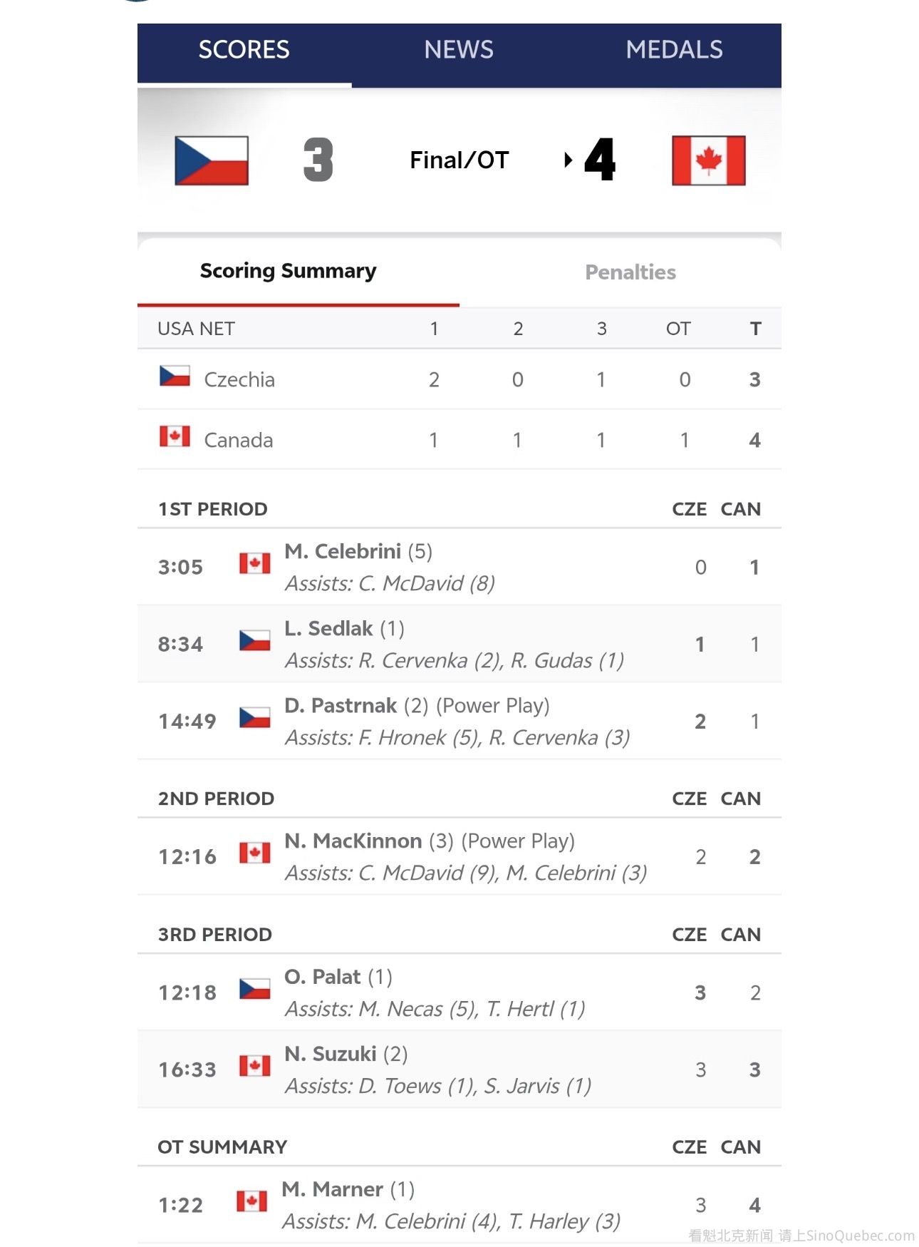 加拿大男子冰球队在2月18日的奥运会四分之一决赛中遭遇苦战,最终以4比3加时赛险胜捷克队,但同时也失去了主力球员、队长Sidney Crosby,为下场半决赛埋下阴影。 第一节比赛刚开始不久,加拿大队就意识到这场比赛绝非易事。捷克队展现出了强烈的复仇欲望,他们渴望弥补小组赛0-5惨败给加拿大的耻辱。 率先取得领先的是捷克队,开场不久就攻球入门,并在第一节结束时以2-1领先。 第二节比赛刚开始不久,加拿大队就遭遇重创。队长Sidney Crosby在中立区被捷克球员撞倒,腿部受伤下场,之后没有重返赛场。 此后加拿大队加快了进攻节奏,但多次射门却未能奏效,两队在第三节都打出了精彩的比赛。比赛还剩不到八分钟时,捷克队进球,无疑让加拿大各地的球迷感到震惊。幸运的是,老将Nick Suzuki在几分钟后远射进球将比分扳成3-3平。两队进入10分钟加时赛。28岁的Mitch Marner 在加时赛开始不到两分钟勇猛射门,助加拿大艰难拿下这场胜利。 |
