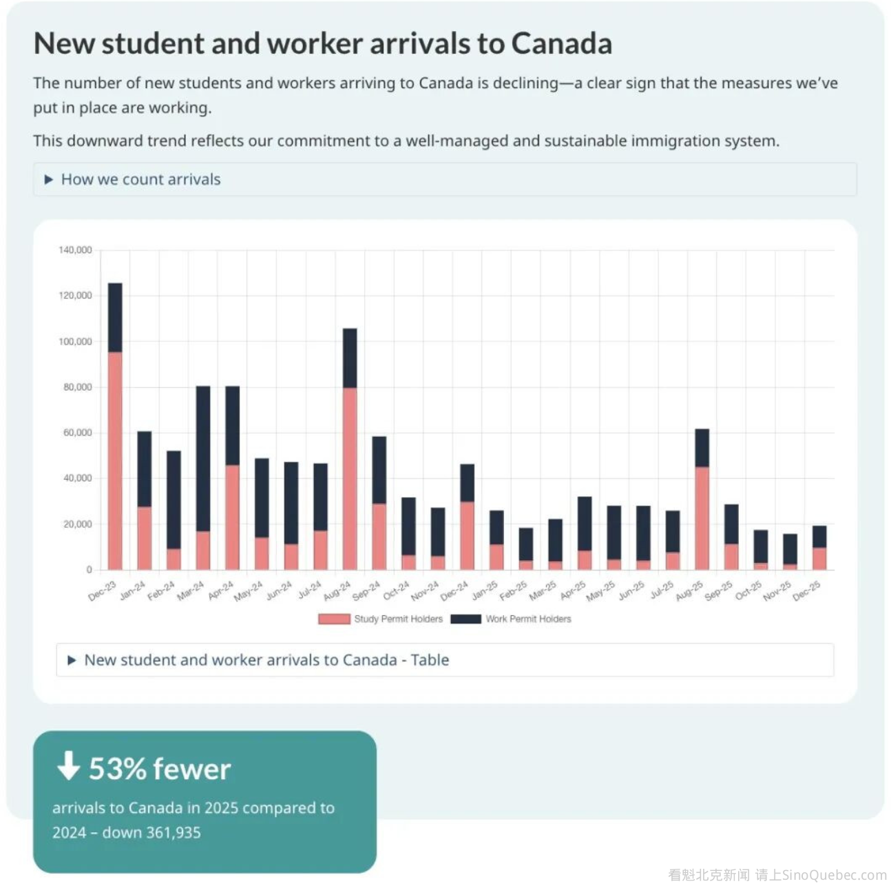 近期,加拿大移民、难民及公民部(IRCC)公布了关于国际学生和临时外籍工人的最新数据。这些数字,直接反映出加拿大正在落实《移民水平计划》的核心目标——把临时人口比例降至5%以下,让移民回归“可持续发展”轨道。 1 新入境人数明显下降,政策开始“见效” 数据显示: 2025年入境加拿大的学生和工人总人数比2024年减少 53% 总减少人数高达 361,935人 这说明什么? 这说明加拿大确实在“主动调控”,尤其是针对临时居民(学生+工签持有人)规模进行压缩。 2 国际学生大幅减少:降幅达61% 2025年新入境学生人数比2024年减少: 177,595人 降幅达 61% 2025年12月新入境学生人数为:9,665人。 为什么会大幅下降? 加拿大采取了几项关键措施: ✔️ 设立2024年学习许可年度上限 ✔️ 2025-2026年继续削减名额 ✔️ 强制核查录取通知书,严打造假 ✔️ 提高资金证明要求 ✔️ 收紧配偶开放工签资格 简单说一句: 留学通道不再是“无限量供给”,而是精细化管理。 但这并不等于关闭大门,而是提高门槛、筛选更优质人群。 3 临时工人数减少47%,低薪岗位受影响最大 2025年新入境工人人数比2024年减少: 184,340人 降幅 47% 2025年12月新入境工人为9,735人。 政府具体做了什么? ✔️ 低薪岗位比例限制在10%(紧缺行业20%) ✔️ 失业率≥6%的都市区停止处理低薪申请 ✔️ 提高高薪岗位最低工资标准 ✔️ 收紧PGWP资格 ✔️ 限制配偶工签 核心逻辑很清晰: 优先保障“已经在加拿大的人”就业 减少低附加值、低薪岗位输入 4 目前加拿大境内临时居民规模 截至2025年12月31日: 仅持学习许可:461,565人 仅持工作许可:1,463,805人 同时持有学习+工作许可:229,650人 可以看到——工作许可持有人占绝对大头。 但需要注意的是,现有申请库存仍按旧规则审理,所以数据的全面下降需要几个月时间才能完全体现。 5 一个重要趋势:临时居民正在大量转PR 很多人忽略了最关键的一点: 2025年1-12月,超过18.8万名原临时居民成功转为永久居民 占当年新PR总数的48% 几乎一半新移民来自“已经在加拿大的人”。 他们主要通过: ✔️ Express Entry ✔️ Provincial Nominee Program(PNP) 这些人具备: ✔️ 加拿大教育背景 ✔️ 加拿大工作经验 ✔️ 英语/法语能力 ✔️ 本地适应能力强 这也是加拿大当前最明确的方向: 优先让已经在加拿大的人留下来 未来3年(2026-2028)还会继续收紧临时入境人数。 |
