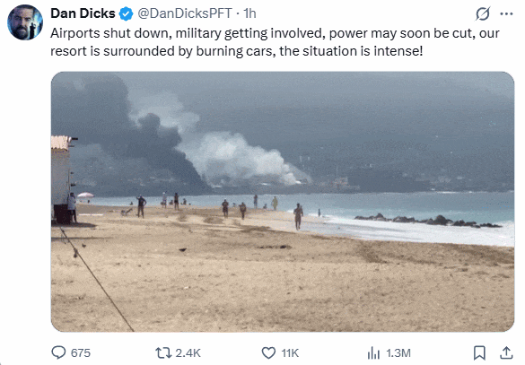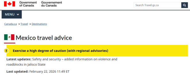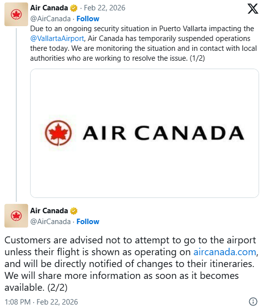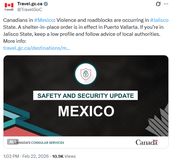 2月22日中午,加拿大外交部(Global Affairs Canada)更新了对墨西哥沿海城市Puerto Vallarta及Jalisco其他地区的旅行警告。原因是当地近期暴力事件突然升级,出现车辆被纵火堵路、联邦当局与武装团体冲突等情况。 ![]() 图源:X 旅行警告中指出,Puerto Vallarta已下达“就地避难令”,所有出租车和网约车服务暂停。加拿大政府建议所有在Jalisco的公民保持低调,关注新闻媒体,并遵守当地政府的指示。 ![]() ![]() 墨西哥风险地图 图源:travel.gc.ca Jalisco的州长Pablo Lemus Navarro在社交媒体平台X上发文称,当天早些时候的一次联邦行动针对Tapalpa(位于Puerto Vallarta东南约300公里)引发了暴力。“此次行动导致一些人纵火焚烧车辆,并在州内多个地区和Jalisco其他地方堵路,以阻碍人员流动。” ![]() 图源:X 游客目击:火光与浓烟来自多伦多的39岁游客Tim Spencer正在Puerto Vallarta度假,他表示,早晨城市就开始出现火灾。他登上Villa Divina酒店屋顶时,看到街角商店和车辆都在燃烧。“现在这里到处都是烟雾,灰蒙蒙一片,空气中还有刺鼻的烧焦气味,就像燃烧的油料味,非常难闻。” ![]() 图源:Robert Onysko Spencer的返程航班原定先飞丹佛再回多伦多,但周日早晨被取消。他说:“我这辈子从没见过这样的情况,真的有点可怕。” 加拿大航空公司取消航班周日下午,加拿大航空在X平台发文称:“由于Puerto Vallarta持续的安全问题,影响了机场运营,我们今天暂时中止了该地航班。我们正密切关注局势,并与当地政府保持联系,以解决问题。” ![]() 图源:X 来自温哥华飞往Puerto Vallarta的WestJet和Flair Airlines航班也被取消。 全州红色警戒据Mexico News Daily报道,Jalisco当局在周日(2月22日)凌晨对Tapalpa进行一次高调执法行动后,宣布全州进入“红色警戒”(Code Red)。此次行动中,Nemesio Oseguera Cervantes(绰号“El Mencho”)据报道已被击毙。 “El Mencho”是实力强大的Jalisco New Generation Cartel(CJNG)头目,该组织是墨西哥最强大的毒品贩运集团之一。 ![]() 图源:U.S. DEA Pablo Lemus Navarro州长在社交媒体X上发文称:“联邦部队几个小时前在Tapalpa展开行动,导致当地出现冲突。此外,由于此次行动,一些人在该地区及哈利斯科州其他地区纵火并堵路,阻碍执法部门行动。” 州长还表示:“我已下令立即成立由三个级别政府部门组成的安全委员会,并启动红色警戒,以防止对民众的任何伤害。” 据报道,Guadalajara市区多处出现路障。与此同时,往返Puerto Vallarta(机场代码PVR)和Guadalajara(机场代码GDL)的所有航班已被改道,直至另行通知。 ![]() ![]() 图源:Charlotte Smith via Mexico News Daily 在Puerto Vallarta,城市上空升起浓浓黑烟。据报道,该地区已有超过10辆车辆在不同地点被纵火焚烧。 这座太平洋海滨度假城市的公共交通已作为预防措施暂停运营。当地多家酒店建议住客留在室内,一些商家也已临时关闭。 Jalisco各地居民通过社区聊天群收到非正式提醒,呼吁大家尽量留在家中,避免不必要的外出。 |