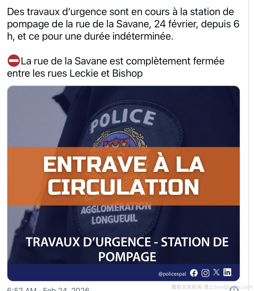 由于一座抽水站进行紧急维修,蒙特利尔南岸Longueuil 一条道路自今天周二早上6点起被迫关闭,且“关闭时间未定”。 Service de police de l’agglomération de Longueuil 在 X 平台发布消息确认 :Longueuil 的 rue de la Savane 在 Leckie 街与 Bishop 街之间已全面封闭。 警方表示:2月24日早上6点起,位于 rue de la Savane 的抽水站正在进行紧急维修,关闭措施将持续至另行通知。