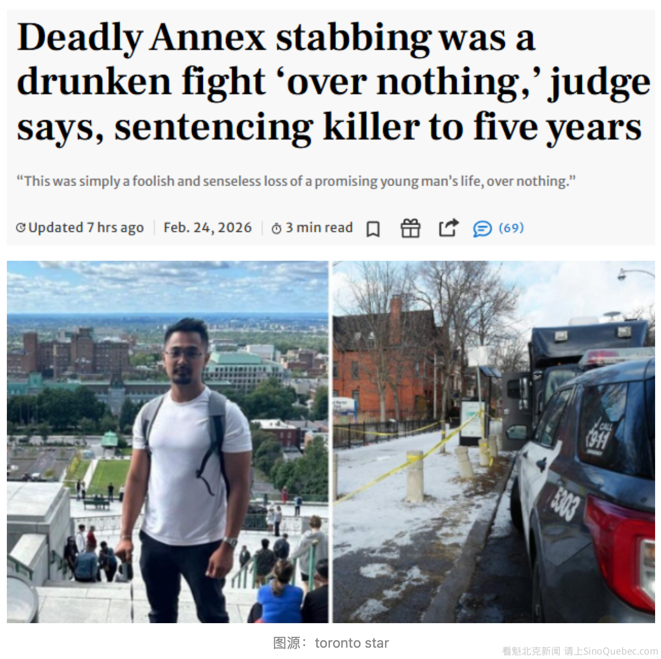一场“毫无意义”的酒后冲突,让两名互不相识的年轻人命运彻底改写——一人丧命,另一人本月因过失杀人罪被判刑。 安大略省法院法官Brock Jones近日对22岁的Cameron Brown判处了五年监禁。Brown已于去年12月认罪,承认在2025年1月26日在Madison Avenue与Bloor Street附近Madison Pub酒吧旁的公园内,持刀刺死了27岁Darapheakdey “Daral” Sovann。Sovann是该市去年的首宗凶杀案受害者,他因颈部中刀伤导致大量失血,很快便不治身亡。 按照审前羁押折抵刑期的标准计算,Brown仍需服刑约三年半。 这场致命冲突仅持续了约一分钟。 案发当晚,Brown和Sovann都处于“严重醉酒”状态,凌晨时分在酒吧外的行人道上相遇。Sovann似乎对Brown说了些什么(具体内容不明),导致 Brown 做出反应并将其引向公园绿地,随后两人发生了推搡冲突。 手持刀具的Brown随后朝Sovann颈部刺了一刀。 Brown最初被控二级谋杀,当晚与他同行的另一人Brooklynn Walsh也面临同样指控。但作为认罪协议的一部分,控方接受Brown并非有意刺向颈部,也无意杀人,因此改以过失杀人罪定罪;对Walsh的谋杀指控则被撤销。 监控录像显示,两人早前都在酒吧内出现过,但没有证据表明他们在店内有任何互动。 Jones法官在判词中写道:“毫无疑问,Sovann的死亡是一场完全可以避免的悲剧。如果Brown当时能表现出与其年龄相符的更多克制与成熟,而不是让情绪压倒判断,Sovann今天仍会活着。这是一起愚蠢、毫无意义的悲剧,一个大好青年的生命就这样白白失去。” 悲剧的经过 案发当晚,Brown和Walsh乘坐一辆派对巴士从Oshawa来到Madison Pub为朋友庆生。午夜过后,两人在酒吧外发生争执,Brown想离开,Walsh则想继续玩。就在他们走回酒吧途中,遇到了迎面走来的Sovann。Sovann说了一句话,让两人同时回头。 随后双方在人行道上发生“对抗性言语冲突”,在Brown的引导下,Sovann跟进旁边的小公园,争执升级,Walsh曾试图拉开他们。 法官形容,Brown随后“像出拳一样快速”刺出那一刀。 行凶后,Brown让Walsh和另一名朋友快跑。三人跑进附近一栋公寓大堂,Walsh给Brown递上免洗洗手液清洗血迹,随后叫出租车将一行人送回Oshawa。 家属悲痛陈述 Sovann的母亲Ratana Kim专程从柬埔寨赶来,在法庭上宣读了受害者影响陈述。她说儿子去世的消息让她“心都碎了”,她原本以为儿子在加拿大生活会是安全和幸福的。 Sovann的兄弟Darachetra表示,母亲现在整日以泪洗面,而他自己的生活也永远改变了。 Brown在庭上向家属道歉,称自己过去一年在狱中不断反思,并决心今后远离酒精,努力做一个更好的人 是否因恶劣羁押条件减刑? 控辩双方共同建议判处五年刑期,但就Brown是否应因羁押环境恶劣获得额外减刑存在分歧。 辩护律师MacDonald 表示,由于他的当事人Brown在只能容纳两人的牢房里挤了三人(需睡在地板上)长达三个月,并频繁遭遇封锁(lockdowns),理应额外获得六个月的减刑。此外,Brown还因一起与其无关的冲突中被狱警撞伤,骨折却被拒绝佩戴护腕。 法官也承认,多伦多南区拘留中心的条件“应受到谴责”且“无法被合理化”,但这并不能成为进一步减刑的理由。 “在这样一起涉及重大暴力的案件中,如果对刑期进行进一步减减免,将导致量刑不当,”Jones 法官写道,“刑期本可以高达八九年。五年已经足够慷慨了。” |
