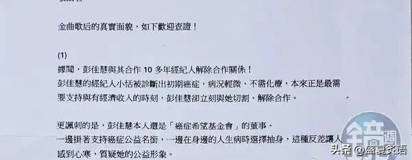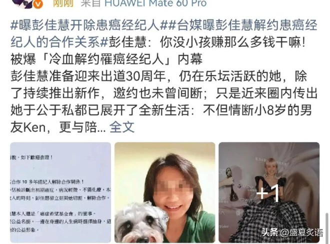 25日,彭佳慧突然冲上热搜,她不仅开除相伴10多年的患癌经纪人,说出的话更寒心:“你又没有小孩,赚那么多钱干嘛”。 今年53岁彭佳慧正迎出道30周年,事业依旧红火,却因一桩解约风波口碑翻车。台媒爆料,她在合作十余年的经纪人苏莹恬(小恬)确诊初期癌症后,当即解除合作,寒心言论更是让网友大跌眼镜。 ![]() ![]() ![]() ![]() 经纪人小恬的病情本不严重,无需化疗,还主动向彭佳慧表示能继续工作,却换来如此回应,伤心之余频频向友人吐苦水。 要知道,小恬是彭佳慧演艺路上的重要伙伴,陪她熬过事业低潮、婚变风波,更是助她拿下金曲歌后的功臣。 彭佳慧曾在获奖时泪谢小恬,还放话要养她一辈子,如今的决绝,让昔日温情显得格外讽刺。 更让人不解的是,彭佳慧还是癌症希望基金会董事,一边做公益帮扶癌症患者,一边却在身边人罹癌时果断切割,言行相悖引发热议。 她的现任经纪人仅回应称已做最大努力,未解释解约核心原因,模糊的说法难以服众。一边是十年相伴的情谊,一边是现实的无情,金曲歌后的这番操作,也让她的路人缘大打折扣。 |