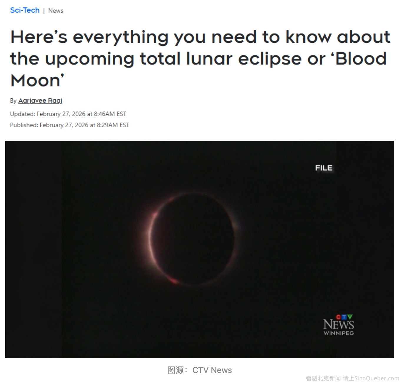 一次月全食(也被称为“血月”)将于3月3日登场。届时,北美、南美、亚洲和大洋洲多地的居民都可以看到这一罕见天象。 下面带你了解什么是“血月”,以及在加拿大哪里能看到。 什么是“血月”? 根据Canadian Space Agency(加拿大航天局,简称CSA)的说法,当地球运行到太阳和月亮之间,月亮进入地球投下的影子时,就会发生月食。 阳光穿过地球大气层时会发生折射,蓝光被散射掉,红光更容易穿透并照到月亮上,因此月亮会呈现出红铜色的光芒,这就是“血月”名字的由来。这种现象只能发生在满月时——也就是月亮运行到地球另一侧,与太阳相对的位置。 CSA解释说:“和日食不同,月食几乎可以被整个半球的人看到,因此观测范围更广,持续时间也更长。”所谓“月全食”,是指月亮完全进入地球影子中最深、最黑暗的部分——也就是“本影”(umbra),那里阳光完全照不到。 CSA还提醒:“如果月食发生在月亮刚升起不久,你可以看到完整过程;如果发生在月亮快要落下前,那你可能只能看到前半段。” 在加拿大哪里可以看到? 据The Weather Network气象学家斯科特·萨瑟兰(Scott Sutherland)介绍,整个过程将持续约5个半小时,其中月亮变红的阶段大约持续近一小时。这次天象将出现在3月3日凌晨至清晨之间。加拿大东部地区的观测时间更接近日出前。 各地时间如下: 圣约翰斯(纽芬兰):凌晨5:14(NST)开始,6:20进入月偏食阶段 哈利法克斯:凌晨4:44(AST)开始,5:50进入月偏食 蒙特利尔、多伦多:凌晨3:44(EST)开始,4:50进入月偏食,约6:04进入月全食 温尼伯、里贾纳:凌晨2:44(CST)开始,3:50进入月偏食,约5:04进入月全食 卡尔加里:凌晨1:44(MST)开始,2:50进入月偏食,约4:04进入月全食 温哥华:凌晨12:44(PST)开始,1:50进入月偏食,约3:04进入月全食 简单来说,从东到西,全国大部分地区都能看到,只是时间不同。想看的话,记得提前设好闹钟。 怎么观看月食? CSA表示,月食是“最容易观测的天文现象之一”,因为不需要任何专业设备。你可以直接用肉眼观看,也可以用望远镜或双筒望远镜增强效果,甚至用手机拍照留念。而且和日食不同,观看月食是完全安全的,不需要佩戴任何护目设备,可以放心看。 如果天气晴朗,找个视野开阔、光污染较少的地方,带杯热咖啡,慢慢欣赏这场自然界的“红月亮秀”就好。 |