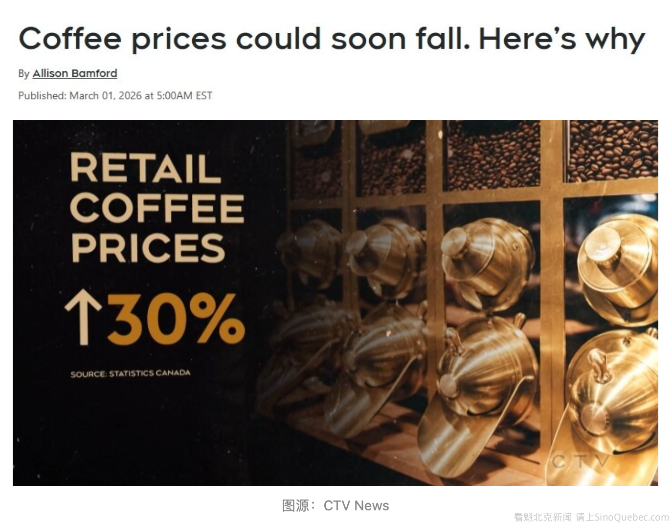 加拿大咖啡行业正在经历全球价格飙升带来的苦涩冲击,不过情况可能很快会有所缓解。 自2020年以来,咖啡价格几乎翻了一倍,这主要是由于气候变化和恶劣天气影响了主要咖啡生产国的收成。加拿大统计局最新数据显示,咖啡平均零售价格同比上涨了30%。 不过,一些专家表示,今年晚些时候价格可能会有所改善。全球最大咖啡生产国巴西预计将在下一个产季迎来创纪录的收成。 圭尔夫大学(University of Guelph)食品经济学家Mike von Massow表示,全球咖啡产量预计将增加4%。他说:“在接下来的几个月里,我们应该会开始看到咖啡市场价格有所缓解。” 他表示,消费者将在超市最明显感受到价格下降,因为此前咖啡价格上涨对零售价格冲击最大。“我们可能无法完全回到上涨前的水平,但我认为超市里的咖啡价格应该会出现明显下降。” 不过,他补充说,咖啡店菜单价格不太可能出现明显变化,因为许多店铺已经自行吸收了部分成本上涨。 他说:“虽然咖啡店环境中可能会出现一些价格调整,但更大的意义在于,这将帮助咖啡店恢复部分利润空间,提高经营可持续性。” 萨斯卡通市中心咖啡店Café Del Rey的店主Devereaux Gatin表示,他们一直努力在控制成本上涨和保持价格稳定之间找到平衡。 他说:“我们尽量自己承担一部分成本,而不是全部转嫁给消费者。” 他说,通常是商家承担70%,顾客承担30%,因此菜单价格只出现了小幅上涨。 不过,在咖啡店运营的过去三年里,Gatin表示,包括牛奶、面粉、糖和咖啡杯在内的许多关键原材料成本都显著上涨。这些成本上涨通常与包装费用有关。他还表示,通胀已经明显影响了消费者行为。 他说:“以前每周来四到五次的顾客,现在消费变得更加谨慎了。” 他说,经营咖啡店需要不断平衡成本和质量之间的关系。 不过,他也表示,咖啡价格只是挑战的一部分。 “虽然未来的预测是积极的,但挑战永远不会停止。” |