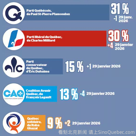 最新民调显示,魁人党的领先优势正随着自由党的回升而迅速缩小。如今,在全球局势动荡的背景下,魁人党领袖Paul St-Pierre Plamondon 推动的公投路线甚至可能成为负担。 根据 Léger–Le Journal–TVA 最新民调,自由党与魁人党支持率已几乎持平,分别为30%与31%。 去年12月,Paul St-Pierre Plamondon 领导的阵营还曾以领先自由党18个百分点的优势独占鳌头。 Léger 副总裁 Sébastien Dallaire 指出:“随着 Charles Milliard 现已稳固其党领地位,自由党出现了一定程度的回暖。” 至于目前执政的CAQ,则未能从经济不稳定局势中受益,甚至首次被魁北克保守党 Parti conservateur du Québec 反超。 尽管在全省层面有所下滑,PQ 在法语选区仍保持稳固优势,支持率高达39%。不过,自由党在这些选民群体中也有所提升,达到19%。 Sébastien Dallaire 指出:“形势确实收紧了很多,但以这样的结果来看……PQ 仍会赢得选举。”不过,根据今天公布的数据,魁人党组建多数政府的前景正在减弱。 此外,对主权的支持也明显降温:如果近日举行独立公投,仅有29%的受访者会投赞成票。 换言之,高达71%的魁北克人将会在选票上勾选“否”。 面对全球局势的动荡,Sébastien Dallaire表示,目前魁北克人更倾向于‘保护既有成果’,而不是‘改变体制’,因为各层面威胁众多。