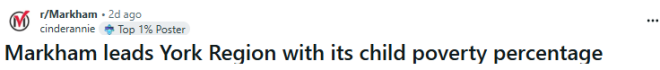 各位华人相信么?约克区的儿童贫困问题正在慢慢加重,尤其是万锦。 反贫困倡议组织Campaign 2000为一份全国年度报告提供的数据显示,在2020年疫情第一年,约克区各个城市和城镇低收入儿童比例曾一度下降。 但接下来的三年里,这一比例又持续上升——从乔治娜(Georgina)到旺市(Vaughan),几乎所有城市都出现增长,到了最近的数据,已经比2018年时更高。 ![]() ![]() 图源:Stock image 在2023年,万锦(Markham)的儿童贫困率达到22.5%,高于加拿大全国平均水平的18.3%。数据显示,该市18岁以下生活在贫困中的儿童共有14,890人,而2018年为13,820人。该市的贫困率领先约克区其他所有城市。列治文山(Richmond Hill)在2023年有21.8%的儿童(约8,120人)生活在低收入家庭中,而乔治娜(Georgina)的比例为18.8%。 家庭经济压力正在加大Campaign 2000全国负责人Leila Sarangi在2月25日发布报告时表示,越来越多家庭正在被生活成本甩在后面。她说:“这意味着家庭用于基本生活开支的收入更少,家庭生活也更不稳定。”“在当前的生活成本危机下,这种情况是无法接受的。” 贫困如何计算该组织使用的是税后家庭低收入衡量标准(Census Family Low-Income Measure After Tax)。按照这个标准,如果一个家庭的收入低于加拿大家庭收入中位数的一半,并且已经根据家庭人数和生活成本进行调整,就会被认定为处于贫困状态。 儿童福利金效果在减弱报告指出,Canada Child Benefit(加拿大儿童福利金,俗称“牛奶金”)在2017年全面实施后,曾帮助全国约58万名儿童避免陷入贫困。不过,报告认为这一政策现在的效果正在减弱。与此同时,很多家庭即使父母有工作,收入仍然不足以让家庭脱离低收入线。 ![]() 图源:Canada.ca 食物银行需求增加约克区非营利机构Family Services York Region的CEO Elisha Laker表示,他们的机构为父母、女性以及不同文化背景的居民提供支持。他说,机构最近看到越来越多家庭依赖食物银行,同时食物不足的问题也在增加。 他说:“高昂的房价以及不断上涨的食品和生活必需品价格,已经超过了很多家庭收入增长的速度,这让有孩子的家庭特别脆弱。”他还表示,该机构的工作主要是帮助家庭应对当前的困难,包括: