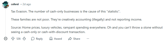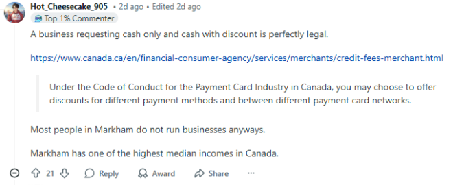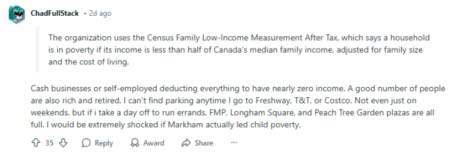 以应对他们认为正在加剧的加拿大收入和财富不平等问题。 网友炸锅:万锦到处是豪宅豪车据悉,约克区新闻网(Yorkregion.com)一开始给这篇报告起的标题是:万锦市的儿童贫困率在约克区位居榜首。 ![]() 看到这个“辣眼”的标题,Reddit网友炸了: “我曾在万锦一所学校工作,这所学校符合午餐资助(lunch assistance)的申请条件,因为它所在社区被认为是低收入社区。但实际上,那里的房子几乎都是百万加元以上的豪宅。学校里有很多学生一方家长在家没有收入,而另一方家长在中国做生意并汇钱过来。所以,从官方统计上看,这些家庭似乎处于贫困状态,因为表面上没有收入。” ![]() “那些只收现金的生意,或者自雇人士把所有开支都抵扣掉,收入几乎为零。还有不少人其实很富有,而且已经退休。我去Freshway、T&T或Costco时,根本找不到停车位。而且不仅仅是周末,即使我请一天假去办事,FMP、朗豪坊和Peach Tree Garden商圈都是满的。如果万锦真的是儿童贫困率最高的城市,我会感到非常震惊。” ![]() “逃税问题。造成这种‘统计数据’的原因,是大量只收现金的生意。这些家庭并不是真的穷。他们在进行创造性(非法)的账目操作,并没有申报收入。依据:房价、豪车,以及各处的高消费水平。而且你走到哪儿都能看到只收现金或现金打折的交易,几乎无处不在。” ![]() 不过,也有网友认为上述说法并不准确:“一家生意只收现金或现金打折是完全合法的。根据加拿大支付卡行业行为准则(Code of Conduct for the Payment Card Industry in Canada),商家可以针对不同的付款方式或不同的支付网络提供折扣。而且,大多数 Markham 的居民根本不经营生意。实际上,万锦的家庭收入中位数是加拿大最高之一。” ![]() 对此,各位华人网友怎么看呢? |