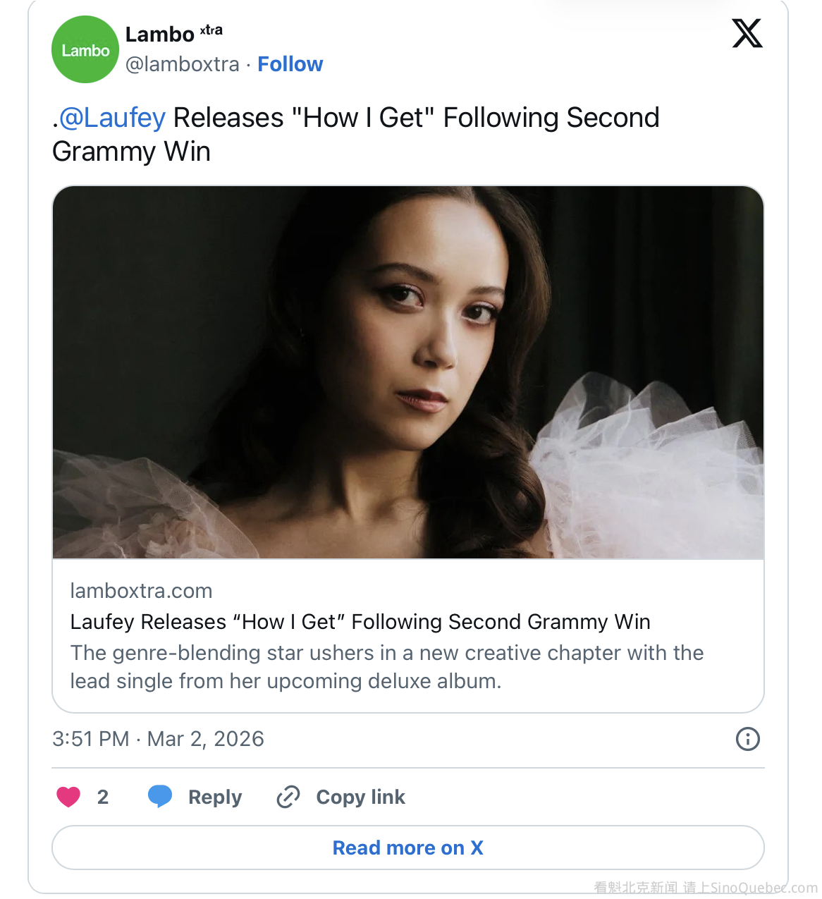 两年后,她再次拿下格林美(Grammy Award)大奖。在早前落幕的第68届格莱美奖颁奖典礼上,26岁的冰岛华裔音乐人林冰(Laufey)再次成为了全场瞩目的焦点。 她凭借第三张录音室专辑《A Matter Of Time》再次斩获第68届格莱美“最佳传统流行演唱专辑”奖。这已经是她第二次亲吻这座留声机奖杯了。当晚的她身着柔美浪漫的礼服,依旧保持着那份俏皮的女孩感。 在典礼现场,当被问及谁是她心目中最爱的“iconic grammy”(双关语,意指格莱美偶像或偶像奶奶)时,林冰脱口而出:“老干妈!” 这种不按常理出牌的幽默感,正是她的魅力所在。 如今的林冰不仅是奖项的宠儿,更是社交媒体上的现象级存在。 在Spotify上,她的月度听众已突破2300万大关,代表作《From the start》收听量更是惊人地超过10亿次;在Instagram上,超过800万粉丝每天追踪着她的复古穿搭与生活碎片。 这次的获奖专辑《A Matter of Time》在美国首周销量为9.9万张,成为近十年最畅销爵士专辑。专业音乐杂志对她的评价极高。《Rolling Stone》认为她“成功地将现代都市女性的困境置于古典旋律的框架内,给出了一份优雅的解答” 。 站在领奖台上,林冰感谢了家人,特别提到了外婆——中国钢琴家胡适熙, "她启蒙了我的音乐生涯,也是我所知道的最端正但美丽的音乐家。" 林冰出身于显赫的音乐世家。外公林耀基是中国著名的小提琴教育大师,被誉为“中国小提琴教育之父”;外婆胡适熙是中央音乐学院知名的声乐艺术指导;母亲林蔚则是冰岛国家交响乐团的首位华人首席小提琴家。 林冰凭借一己之力让爵士乐在Z世代的耳机中重焕生机,使其重新成为一种属于年轻人的潮流音乐。或许,她就是下一代流行女王。 格莱美二封 VOGUE金九封面 在第68届格莱美的舞台上,林冰不再是那个一年前首次登台时会因为紧张而嗓音颤抖的小女孩了。 在MusiCares年度人物晚宴上,她以极其丝滑的爵士风格重新演绎了玛丽亚·凯莉的经典歌曲《It’s Like That》。她接受采访时说: 用一种我更熟悉的风格演唱她的歌曲,这真的很酷。这首歌已经成为经典。 在获奖感言中,她动情地恳请社会不要削减对艺术教育的财政预算,因为她今日的一切皆源于此。 她的获奖专辑《A Matter Of Time》首日播放量便高达1205万,首周空降Billboard第四位。专辑中的单曲如《Lover Girl》不仅旋律迷人,其MV更是由她的双胞胎妹妹Junia亲自操刀,创造出一种温柔克制却又极具生命力的视觉叙事。 林冰的商业价值与时尚影响力同样在过去一年中迎来了爆发。去年,她登上了极具分量的斯堪的纳维亚版《VOGUE》八九月合刊的“金九”封面。来自主流审美的认可,证明了她不仅是音乐圈的黑马,更是时尚界的复古缪斯。 去年12月,她受邀参加了纽约洛克菲勒中心的圣诞点灯仪式,在现场演唱了歌曲《Santa Baby》。 这个舞台一向是纽约年度最重磅、最受瞩目的活动之一,Lady Gaga、霉霉都曾在此演出。林冰在现场表现得极其享受,全然进入了音乐的怀抱。 林冰不仅吸引了年轻一代,连不少演艺界大前辈也是她的忠实拥趸。好莱坞著名女星、《欲望都市》主演莎拉·杰西卡·帕克就在社交媒体上公开分享了林冰的歌曲《Snow White》,并坦言这首歌让她在回纽约的巴士上“哭了一路,哭到颤抖”。 美籍华裔运动员刘美贤也是她的忠实粉丝。在这两天的冬季奥运会花滑比赛上,刘美贤用林冰的歌曲《Promise》作为参赛乐曲,在这个属于全世界的大舞台上推广自己最爱的歌手。 林冰用她那如红酒般复古、醇厚的歌声,精准地击中了不同年龄层受众内心最柔软的地方。 跨越半个地球的音乐世家 从北京到雷克雅未克 林冰的音乐基因里刻着一种“闯”的劲头,这很大程度上来自于她的母亲林蔚。 1964年出生于广州的林蔚,从小就在父亲林耀基的严苛指导下学习小提琴,“当年父亲每天骑着自行车,来回一个半小时陪我练琴”。 在特殊的时代背景下,父亲暂停了对她的指导,让她顺其自然发展,却反而培养了她的独立性。她最终凭借毅力考入中央音乐学院,并在大学期间获得英国市政厅全额奖学金,赴伦敦深造。 1988年,林蔚放弃了亚洲的舒适生活,只身前往遥远且陌生的冰岛,加入了冰岛国家交响乐团,并定居在雷克雅未克。 怀孕30周时,她还在教堂录制打击乐激烈的现代作品,因为音乐声音十分激烈,肚中胎儿却没有动静,回家后她还特意用琴弓制造噪音测试胎儿的反应,直到孩子有了反应才放心。 正是在这样一种中西文化交融、充满冒险精神的环境中,林冰和妹妹Junia出生了。 林冰的童年是浸润在音乐里的。父亲虽然是冰岛人,不从事音乐行业,却是资深爵士乐迷,家里常播放Chet Baker、Ella Fitzgerald等爵士大师的作品,林冰从小耳濡目染。 外公林耀基更是她们音乐之路的启蒙人,他把小提琴当成玩具带给孙女们玩耍,常常给孩子们哼唱《窈窕淑女》等好莱坞经典电影的主题曲,培养了林冰对老歌的热爱。 她和妹妹在一岁还不会说话时,就能哼唱出电视里歌曲的和声。 林蔚在教育上也深受父亲“林氏教学法”的影响,讲究“内心歌唱率两手”以及“匀准美”的审美标准。 当她发现林冰嗓音低沉时,并没有强迫女儿学习自己擅长的小提琴,而是支持她学习大提琴,因为她相信大提琴才是林冰“内心的声音”。4岁学钢琴,后来又兼修大提琴,林冰的音乐根基在严谨的古典训练与家庭成员随性的合奏中逐渐稳固