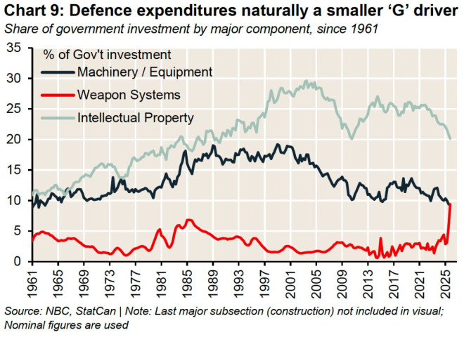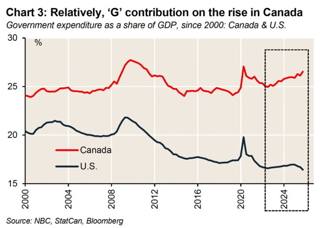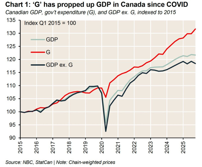 加拿大经济正在越来越依赖政府“花钱”。一份来自加拿大国家银行的报告指出,近年来政府投资增长速度已经远远超过整体经济增长。在私人投资疲软的情况下,公共支出正在支撑经济,但这也意味着债务不断增加,未来借钱的成本可能会更高。 ![]() ![]() 图源:BetterDwelling Better Dwelling的文章指出,最近,更多公共支出被投入到资本项目中,包括国防开支,但把工资支出换成购买武器,并不会自动把债务转化为真正的生产性增长。 加拿大公共投资增长超过GDP两倍过去十年里,加拿大政府支出的增长速度远远快于整体经济。为了说明这种差距,报告重点分析了GDP中的“G”,即政府消费和固定资本投资。 由于私人投资疲软甚至出现停滞,经济增长越来越依赖政府支出来填补空缺。过去三年里,公共部门固定资本投资的年复合增长率达到3.5%,而整体GDP增速只有1.7%。 报告中的指数图显示,这并不是长期趋势,而是疫情之后出现的变化:当私人投资不足时,政府支出开始填补这一空缺。 报告写道:“过去十年,加拿大政府支出的增长已经明显超过整体经济增长。” ![]() 图源:NBC, StatCan 政府支出正在掩盖私人经济疲弱近年来,由政府支出推动的GDP占比明显上升。在2020年之前,政府支出占GDP超过25% 的情况通常只会出现在极端经济衰退时期,例如全球金融危机或疫情期间。 疫情之后,这一比例一度回落到历史平均水平附近,但到了2022年又开始迅速上升。 如今,加拿大经济再次高度依赖政府支出,占GDP超过四分之一。而这一变化发生在贸易冲击出现之前。 如果把加拿大与美国进行比较,这种差距更加明显。自2022年以来,加拿大在GDP多个主要组成部分上都落后于美国,其中非住宅商业投资表现尤其令人担忧。 ![]() 图源:NBC, StatCan 报告指出:“在与美国经济对比中,政府支出增长几乎是加拿大唯一的优势,而美国在其他经济增长领域的表现都更强。” 不过报告也提到,加拿大政府支出中用于固定资本投资(而非日常消费)的比例正在上升。 公共债务仍在增加:从雇人转向买武器再来看政府支出的结构及其含义。政府消费主要用于日常运营,例如工资支出;而固定资本投资则用于基础设施建设,例如道路、医院以及军事能力。目前推动增长的正是后者。 政府项目支出预计将明显放缓:过去十年的年复合增长率为8.1%,但预计到2029-2030年 将降至0.5%,其中裁减公务员队伍将起到重要作用。 与此同时,资本支出,例如购买武器装备正在填补这一空缺,甚至超过原有水平。 ![]() 图源:NBC, StatCan 政府支出计划将提高借贷成本信贷本质上是一个市场体系,借款成本由资金供求关系决定。当借款需求超过可用资金时,贷款机构会要求更高利率;当资金过剩时,借贷成本则会下降。 由于政府债券收益率是许多贷款利率的基准,包括企业贷款和房贷,渥太华不断增加支出不仅会提高税负,也会推高整体借贷成本。这意味着房地产需求、私人投资以及其他对利率敏感的经济领域都会承受更大压力。 NBC警告,这种政策代价不小:“类似美国的扩张性财政政策,将使主权债券收益率曲线长期维持在较高水平。” 报告还指出,财政负担正越来越多地转移到各省政府身上,预计到2026年,地方政府将成为借贷缺口的主要来源。 国防支出或带来短期好处,但难以解决根本问题无论是谁借钱,只要借贷增加,债券收益率都会上升。但报告认为,债务用途的结构同样重要。投资者通常更能接受用于长期生产性资产的债务,而不是用于日常开支。 NBC认为:“随着时间推移,更高的国防支出可能会重新激活加拿大的制造业基础,而这一领域近年来在全球的影响力不断下降。” 不过报告也强调,这并不等于问题已经解决。这更像是“被打在肚子上,而不是更痛的地方”,痛苦减轻了,但依然存在。 国防制造业或许能带来短期缓解,但它仍然高度依赖政府需求,而不是市场驱动的增长。如果没有足够强大的私人经济基础支撑,最终结果只是让公众承担更大的债务负担,外加利息。 |