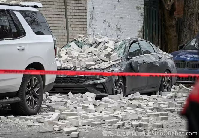 昨天周二下午,蒙特利尔Westmount 发生惊险一幕:一栋住宅楼外墙突然坍塌,大量砖块从天而降,砸中停在路边的一辆汽车,而车内当时正坐着一名男子。 事故发生在 13点30分左右,地点位于 Victoria Avenue 靠近 Sherbrooke Ouest。 一栋住宅楼的外墙饰面突然脱落,数百块砖头掉落到后巷,砸中两辆停放的汽车,其中一辆受损最严重,当时车内正有一名三十多岁的男子。 砖块将汽车车顶压塌,并砸毁了挡风玻璃和引擎盖。 所幸该男子仅头部受伤但没有生命危险,现场没有其他人受伤。 紧急救援人员随后赶到现场救助伤者并封锁区域。消防人员初步检查后认为,建筑物整体结构仍然稳定,没有立即倒塌风险,但仍将进行进一步检查。 当天下午,工作人员计划拆除剩余松动的外墙砖块,并清理现场。