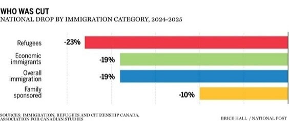 不同类别移民变化不同移民减少在不同类别中也并不均衡。根据分析,难民类别降幅最大,其次是经济类移民,然后是家庭团聚类移民。 2025年难民人数比2024年减少23%,并且所有省份都出现下降。其中降幅最大的是萨省,下降 32.5%,安省、新斯科舍省、纽芬兰省下降 26.5%。 降幅最小的是爱德华王子岛省,下降 5%,魁北克下降 5.5%。 ![]() 图源:National Post 相比难民的23%降幅,家庭团聚类移民全国只下降约10%,其中降幅最大的是卑诗省,下降 13%,安省下降 11%。 经济类移民全国下降19%,其中降幅最大的地区包括爱德华王子岛省,下降 47%,新斯科舍省下降 40% 不过,西北地区经济类移民反而增加16%,而魁北克也增加 2.8%。 Jedwab指出:“魁北克几乎没有受到这些削减的影响。”他解释说,由于魁北克与联邦政府之间的移民协议,该省在永久居民数量上没有减少,而安省的降幅也相对较小。 移民来源国也出现变化2025年获得加拿大永久居民身份的人数减少,并且来源国家出现明显变化。 降幅最大的国家包括: