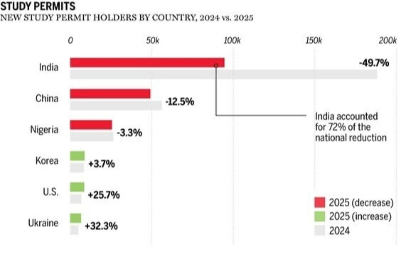 按2025年实际移民人数,来自印度的移民仍高居首位(98770人),其次是菲律宾(25215人)、喀麦隆(22915人),中国排第四位(21095人)。 留学生和外劳人数也下降2025年,加拿大国际学生学习许可(study permit)数量比2024年下降超过25%,相当于减少131,010份新签证。 其中降幅最大的来源国是印度,学习许可数量从188,175份降至94,605份,下降50%,占整个降幅的72%。 ![]() 图源:National Post 来自中国的学习许可持有人减少12.5%,从56,175份,减至49,125份。来自尼日利亚的学习许可持有人减少3.3%,从 26,445份,减至25,570份。这是前三大学习许可来源国。 同时,一些国家的学生数量反而增加。美国增加 25.7%,从6,780份,增至8,525份。韩国增加 3.6%,从8,455份,增至8,765份,乌克兰增加32%,从5,010份,增至6,630份。 与此同时,临时外籍劳工(TFW)人数也下降近12%,从190,945人降至168,245人。 降幅最大的地区包括: